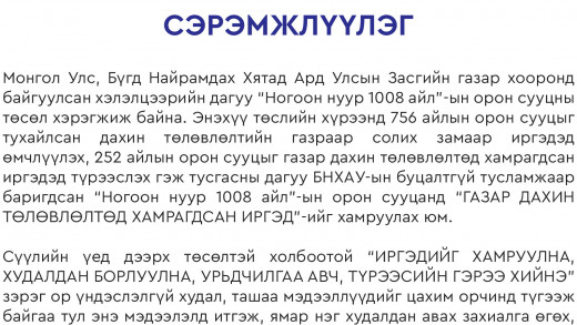 НОГООН НУУР 1008 АЙЛЫН ОРОН СУУЦАНД ХАМРУУЛНА ГЭСЭН ТАШАА МЭДЭЭЛЛЭЭС СЭРЭМЖЛЭХИЙГ АНХААРУУЛЛАА 2025/11/13 "Ногоон нуур 1008 айл"-ын орон сууцанд иргэдийг хамруулна, худалдан борлуулна, урьдчилгаа авч түрээсийн гэрээ хийнэ зэрэг ор үндэслэлгүй, худал, ташаа мэдээллүүдийг цахим орчинд түгээж буйтай холбоото…
