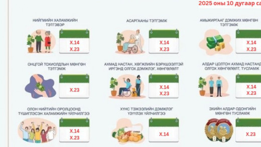 НИЙГМИЙН ХАЛАМЖИЙН ТЭТГЭВЭР, ТЭТГЭМЖ, ХӨНГӨЛӨЛТ, ТУСЛАМЖИЙН ОЛГОЛТЫН ХУВААРЬ /2025.10 САР/ 19 цагийн өмнө Нийгмийн халамжийн тэтгэвэр, тэтгэмж, хөнгөлөлт, тусламжийн 2025 оны 10 дугаар сарын олголтын хуваарийг танилцуулж байна.