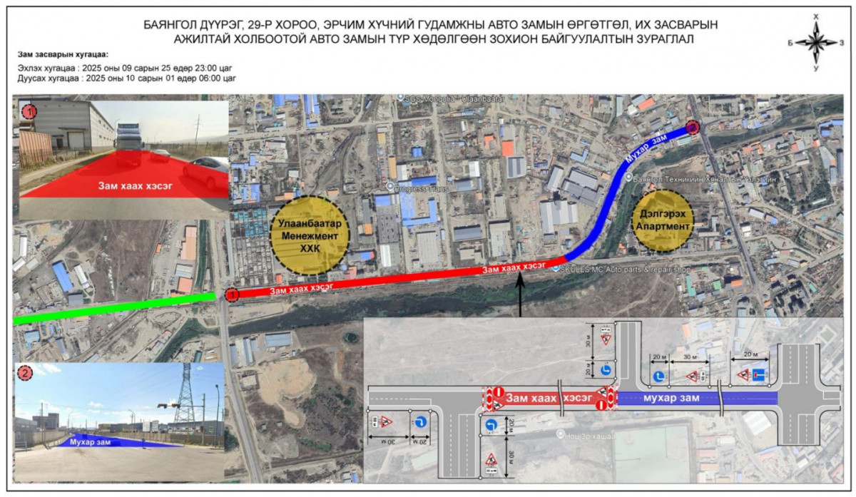Энэ хүрээнд Наадамчдын авто замыг Эрчим хүчний гудамжтай холбосон авто замын уулзвараас Хөсөг трейдийн баруун урд талын уулзвар хүртэлх 1.3 км авто замыг өнөөдөр /2025.09.25/ 23 цагаас аравдугаар сарын 1-ний 6 цаг хүртэл хугацаанд хааж, зам барилгын ажил гүйцэтгэнэ.
