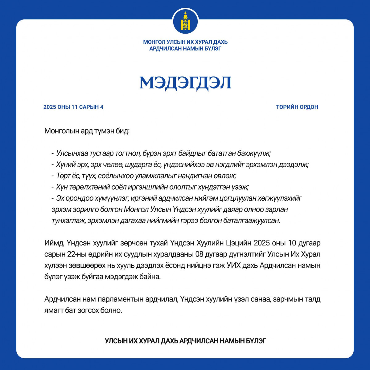 Иймд, Үндсэн хуулийг зөрчсөн тухай Үндсэн Хуулийн Цэцийн 2025 оны 10 дугаар сарын 22-ны өдрийн их суудлын хуралдааны 08 дугаар дүгнэлтийг Улсын Их Хурал хүлээн зөвшөөрөх нь хууль дээдлэх ёсонд нийцнэ гэж УИХ дахь Ардчилсан намын бүлэг үзэж буйгаа мэдэгдэж байна.