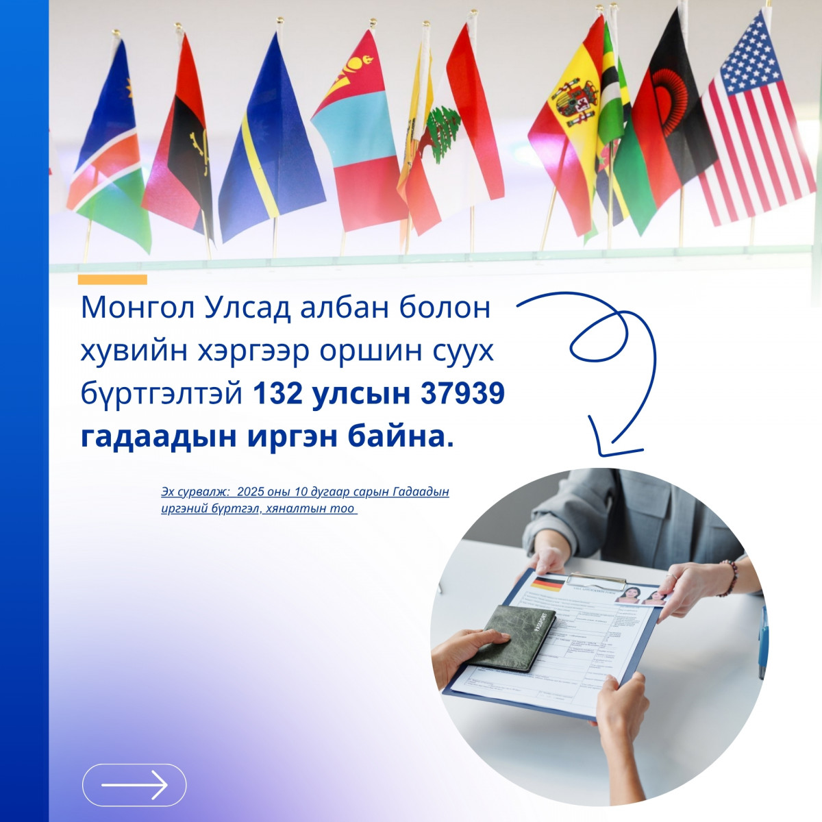 Монгол Улсад 2025 оны 10 дугаар сарын 31-ний өдрийн байдлаар 132 улсын 37939 гадаадын иргэн албан болон хувийн хэргээр оршин суух бүртгэлтэй байна. Эдгээр иргэдийг улсаар нь авч үзвэл АНУ-ын 1004, БНСУ-ын 1594, БНХАУ-ын 24626, ОХУ-ын 2720 иргэн, бусад улсын 7995 иргэн байгаа юм.