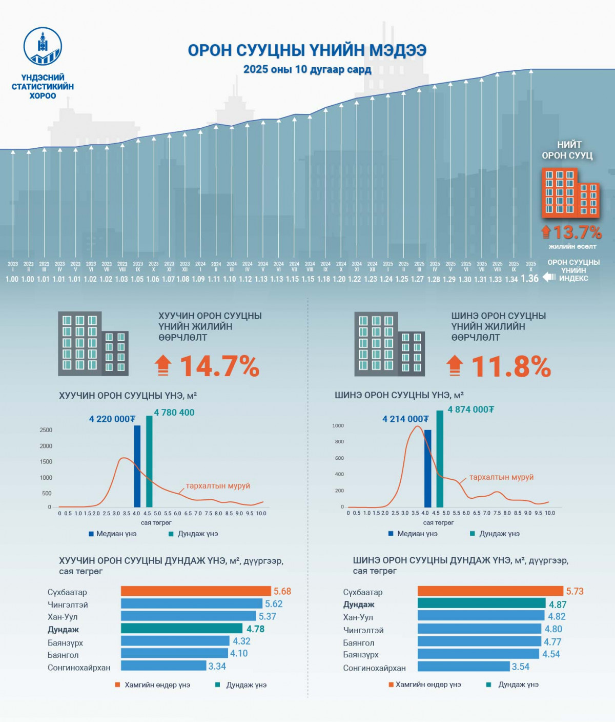 Орон сууцны үнийн индекс 2025 оны 10 дугаар сард 1.36 болж, өмнөх оны мөн үеэс 13.7 хувиар, өмнөх сараас 1.3 хувиар тус тус өссөн байна.