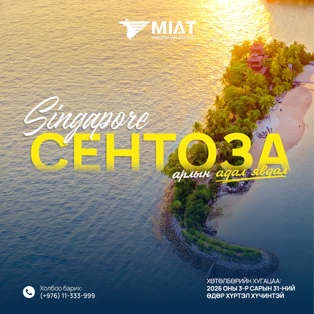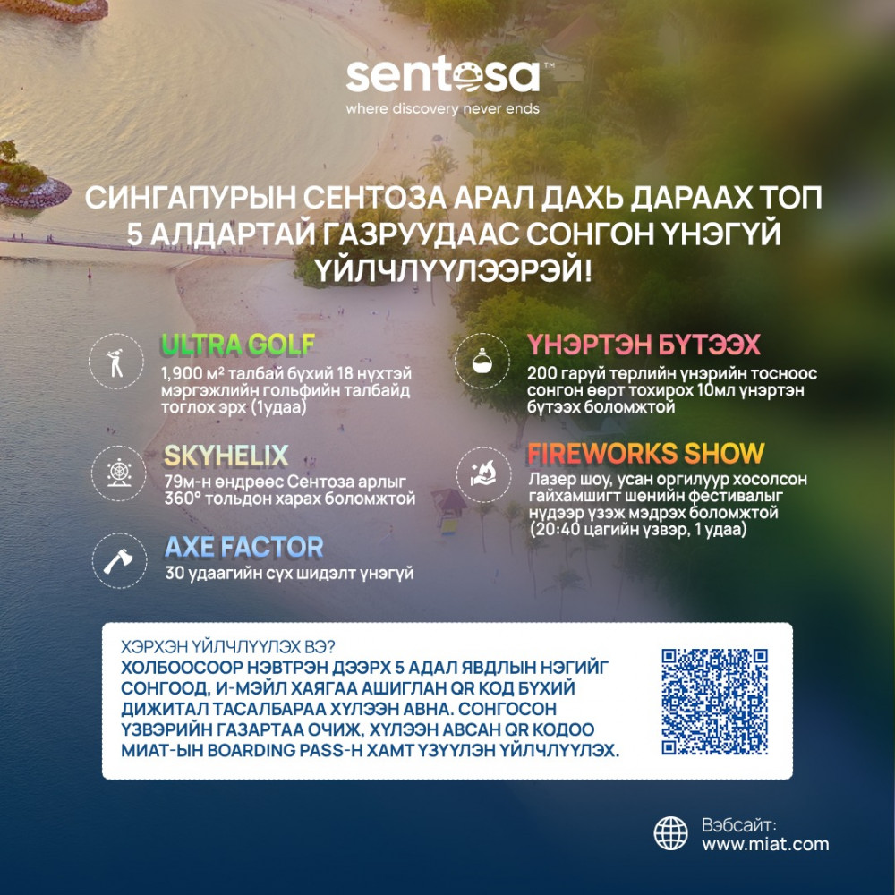 МИАТ ТӨХК-өөр үйлчилүүлэн Улаанбаатар - Сингапур чиглэлд зорчоод Сентоза арлын дараах 5 алдартай газруудаас нэгийг сонгон үнэгүй үйлчлүүлэх боломжтой болжээ. Үүнд: