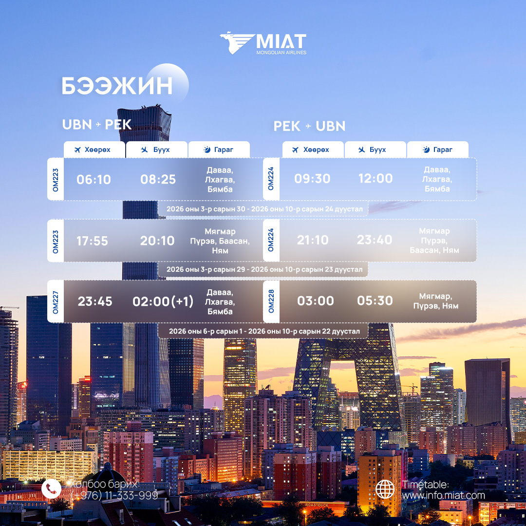 МИАТ ТӨХК Бээжин чиглэлийн 2026 оны зуны цагийн хуваариа танилцуулав.