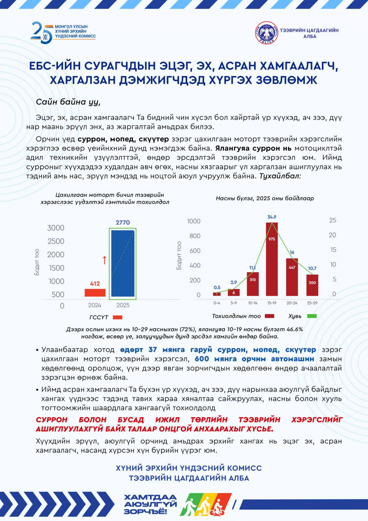 Хүний эрхийн Үндэсний Комиссоос цахилгаан моторт бичил тээврийн хэрэгсэл буюу мопед, скүүтер, суррон, цахилгаан дугуйны хэрэглээ өсвөр үеийнхний дунд нэмэгдэж, үүнтэй холбоотойгоор хүүхэд өртсөн болон бусдыг гэмтээсэн осол, гэмтлийн тохиолдол эрчимтэй нэмэгдэж байгаатай холбогдуулан хүүхдийн аюулгүй байдлыг хангах, осол гэмтлээс урьдчилан сэргийлэх чиглэлээр Боловсролын ерөнхий газар, Монголын хувийн сургуулиудын холбоонд хамтран ажиллах албан бичиг хүргүүллээ.