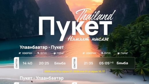 МИАТ ТӨХК нь Пукет чиглэлдээ 2025 оны 12-р сарын 27, 2026 оны 1-р сарын 2, 10, 17-ны өдрүүдэд нэмэлт нислэг зарлалаа. Тийз захиалах болон дэлгэрэнгүй мэдээллийг +976 11 333-999 дугаараас авна уу.Таса…