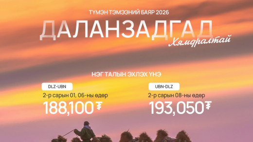МИАТ ТӨХК нь "Түмэн тэмээний баяр 2026" арга хэмжээг тохиолдуулан Даланзадгад чиглэлд 2026 оны 2-р сарын 1, 6-н болон 8-ны өдрүүдийн нислэгүүддээ хямдрал зарлажээ. 2026 оны 2-р сарын 1, 6-ны өдрийн Д…