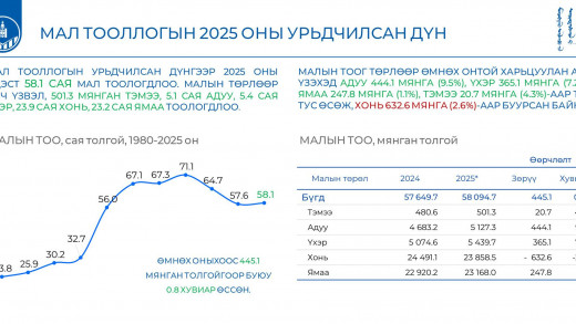 ХӨВСГӨЛ АЙМАГ 5.3 САЯ ТОЛГОЙ МАЛААР УЛСАД ТЭРГҮҮЛЖ БАЙНА 2025/12/28 Улсын хэмжээнд 2025 оны эцэст, мал тооллогын урьдчилсан дүнгээр 58.1 сая толгой мал тоологдлоо. Малын тоо өмнөх оноос 445.1 мянган толгойгоор буюу 0.8 хувиар өссөн байна. Малын тоог төрлөөр нь авч үзв…