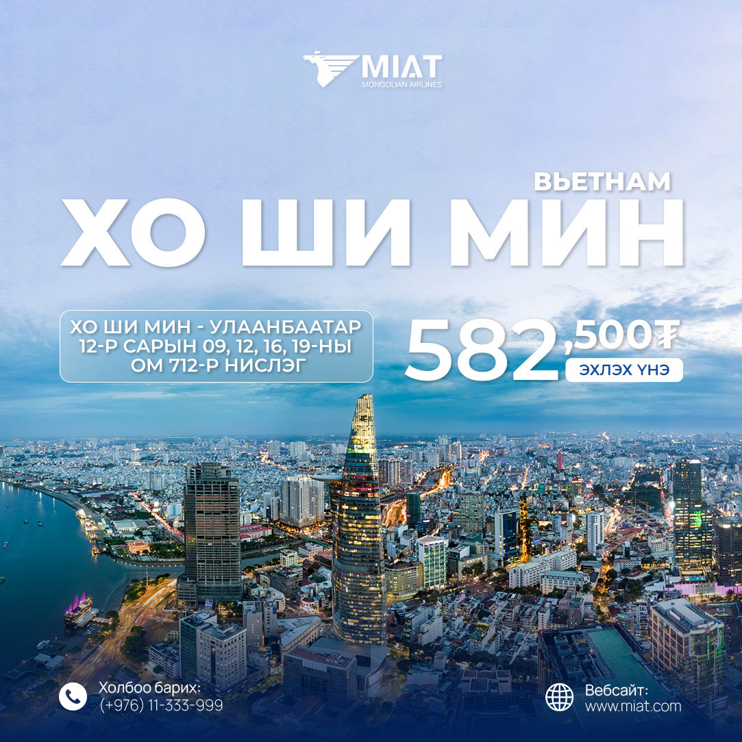 МИАТ ТӨХК нь Хо Ши Мин - Улаанбаатар чиглэлийн OM712 аяллын дугаартай 12-р сарын 9, 12, 16, 19-ний өдрүүдийн нислэгүүддээ тийзийн хөнгөлөлт зарлалаа.