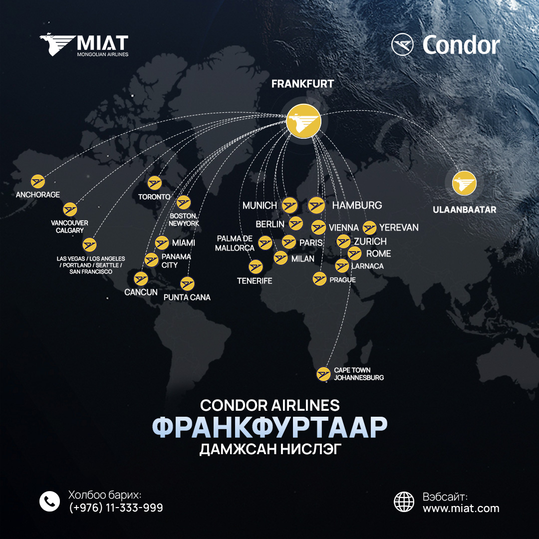 Та МИАТ компанийн нислэгээр Улаанбаатараас Франкфурт хүрч цааш Condor Airlines компанийн нислэгээр дараах хотууд руу хямдралтай үнээр зорчих боломжтой боллоо.