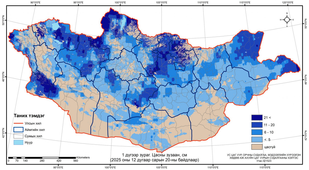 Цаг уурын байгууллагаас арав хоногт нэг удаа хийдэг хээрийн цасны хэмжилтийн мэдээгээр арваннэгдүгээр сарын 20-ны байдлаар нийт нутгийн 79 хувьд цастай байна. Үүнээс