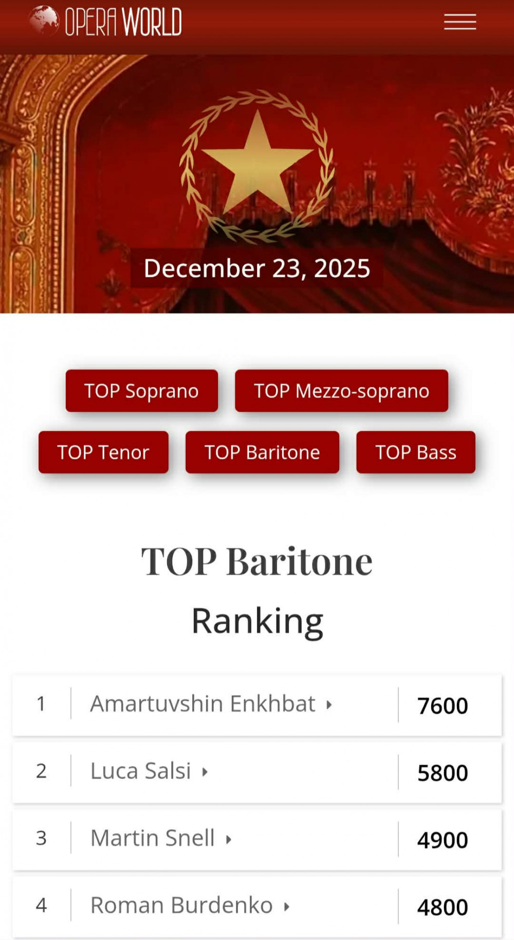 Э.Амартүвшин Шилдэг баритоноор гурав дахь удаагаа шалгарч буй нь энэ бөгөөд өмнө нь 2020, 2023 онуудад мөн шагналыг авч байсан юм. Дэлхийн шилдэг баритоны чансааг Ардын жүжигчин Э.Амартүвшин өнөөдрийн байдлаар 7600 оноогоор тэргүүлж яваа нь "тасархай" үзүүлэлт бөгөөд баритоны хувьд 2-т бичигдэж буй дуучны оноо 5800, дуурийн бусад төрлийн чансааг тэргүүлж буй дуучдын оноо ч 5600, 5700 орчим л байгаа юм.
