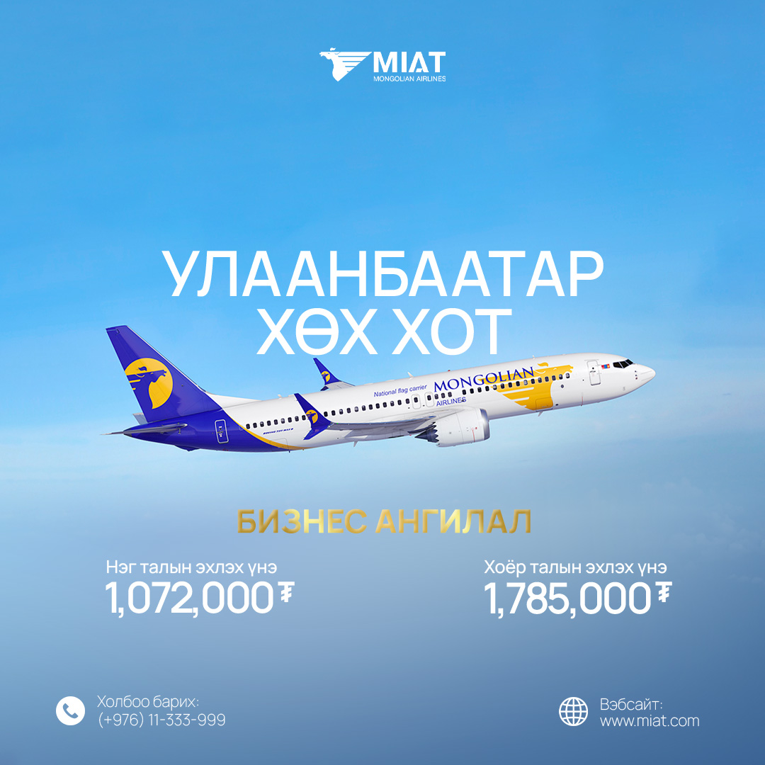 МИАТ ТӨХК нь 2025 оны 1 дүгээр сарын 04, 07-ны өдрүүдэд Хөх Хот чиглэлдээ B737 MAX агаарын хөлгөөр нислэг үйлдэхээр боллоо. Та бүхэн тус нислэгүүдээр Бизнес ангиллыг сонгон тав тух, сэтгэл ханамжтай зорчоорой.