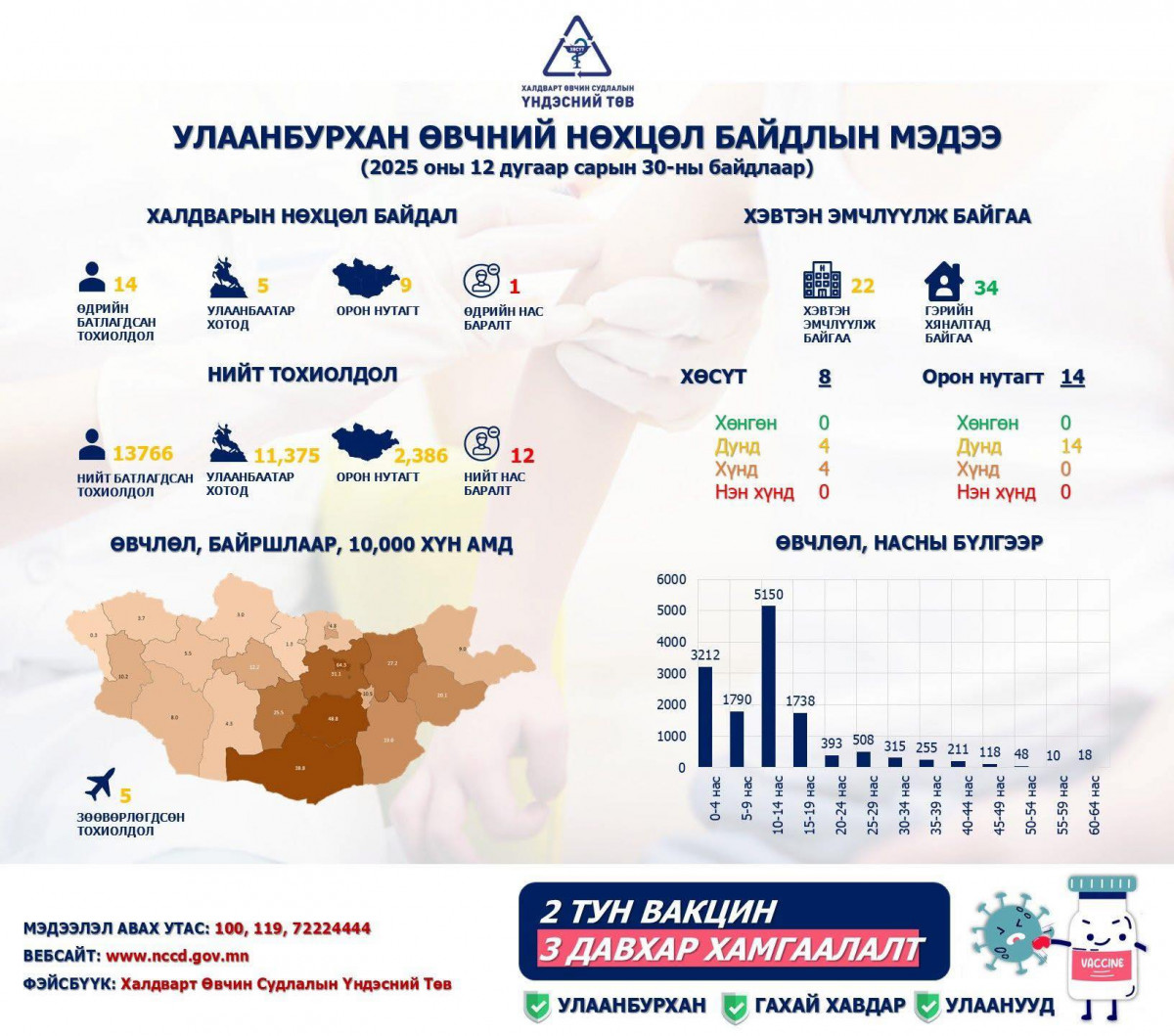"Улаанбурхан өвчний халдвар нэмэгдэх хандлагатай байна. Томуутай хавсарч бага сартай хүүхдүүд хүндэрч байгааг ХӨСҮТ-ээс анхааруулж байна. Улаанбурхны халдвар авч найман сартай хүүхэд нас бараад байна. Өнөөдөр 4 хүүхэд хүнд оноштой ХӨСҮТ-д эмчлүүлж байна. Маск зүүж, вакцинд нь хүүхдээ хамруулж хамгаалахыг зөвлөж байна. Бүх сум, өрхийн эмнэлгүүд улаанбурхны эсрэг вакцин өдөр бүр хийж байна" гэсэн байна.