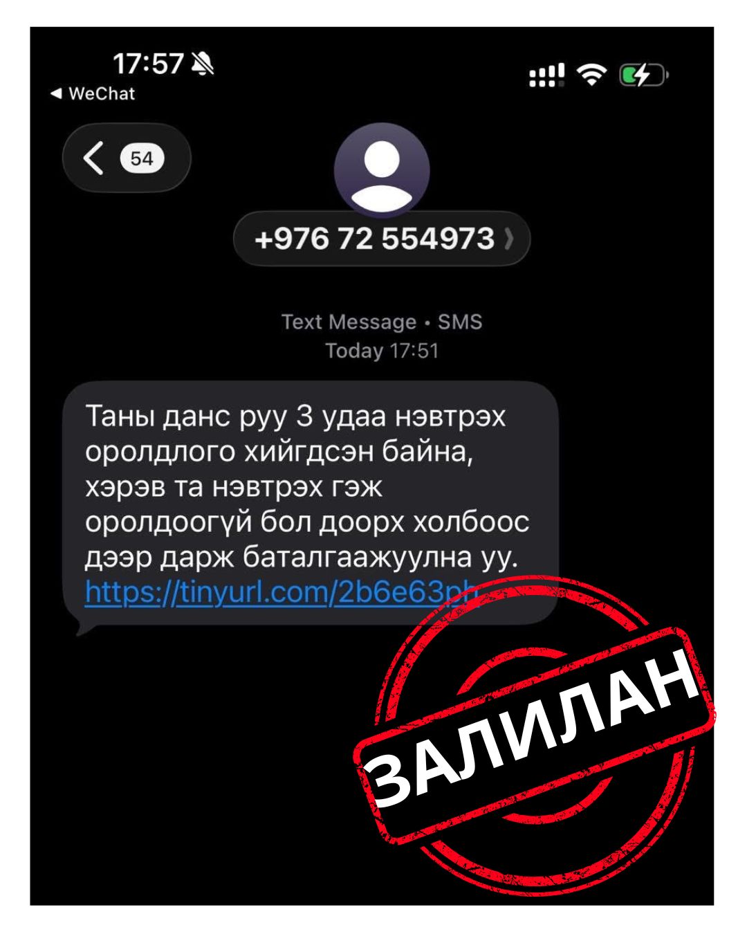 Сүүлийн үед “Таны данс руу 3 удаа нэвтрэх оролдлого хийгдсэн байна, хэрэв та нэвтрэх гэж оролдоогүй бол доорх холбоос дээр дарж баталгаажуулна уу” гэх агуулгатай хуурамч /SMS/ мессеж илгээж, иргэдийг хууран мэхлэх замаар тухайн холбоос дээр даруулан интернет банкны нэвтрэх нэр, нууц үг, баталгаажуулах код зэрэг хувийн мэдээллийг нь хууль бусаар авч иргэдийг залилах гэмт хэрэг бүртгэгдэж байна.