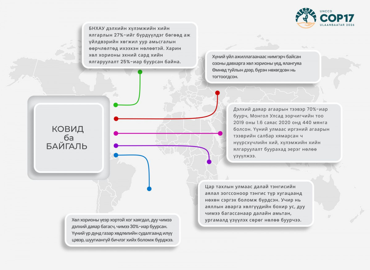 Дэлхий даяар дунджаар 11-19 мянган онгоц, 500 мянган хүн агаарт байнга байдаг гэсэн тооцоо бий. Харин одоо энэ тоо 70 хувиар буурчээ. Монгол Улсын хувьд гэхэд л 2019 онд 1.6 сая зорчигч тээвэрлэж байсан бол 2020 онд 440 мянга болж буурсан. Ингэснээр нүүрсхүчлийн хийн хаягдлын 2-3 хувийг ялгаруулдаг иргэний агаарын тээврийн салбар хямралд орсон бол хүлэмжийн хий багасахад эергээр нөлөөлжээ.