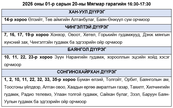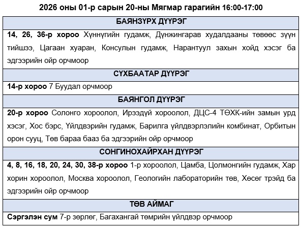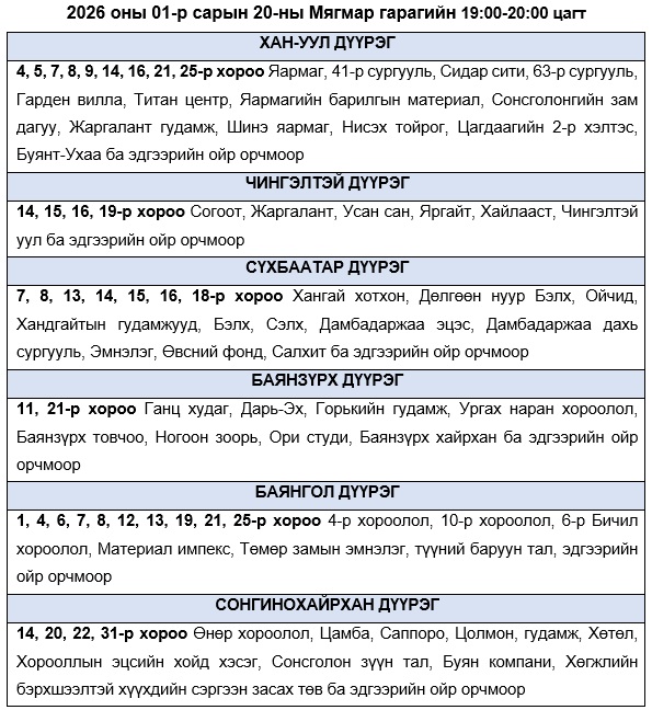 Эрчим хүчний чадлын дутагдлаас шалтгаалан 2026 оны нэгдүгээр сарын 20-ны Мягмар гарагт хязгаарлалт хийж “БОЛЗОШГҮЙ” байршлуудын хуваарийг УБЦТС ТӨХК-аас мэдээллээ.