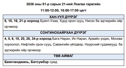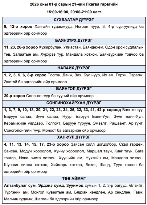 Эрчим хүчний чадлын дутагдлаас шалтгаалан 2026 оны 1-р сарын 21-ний Лхагва гарагт цахилгаан эрчим хүчний “ХЯЗГААРЛАЛТ ХИЙЖ БОЛЗОШГҮЙ” байршлуудын хуваарийг УБЦТС ТӨХК-аас мэдээллээ.