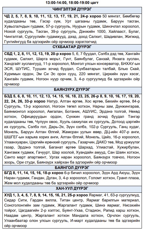 Эрчим хүчний системд аваарын горим үүсэхээс сэргийлэн нийслэлийн хэмжээнд тодорхой байршлуудад цахилгаан эрчим хүчний төлөвлөсөн хэрэглээг “Диспетчерийн үндэсний төв” ТӨХХК-ийн шийдвэрээр хуваарийн дагуу 1-ээс 1 цаг 30 минутын хугацаатайгаар хязгаарлах арга хэмжээ авч байна.