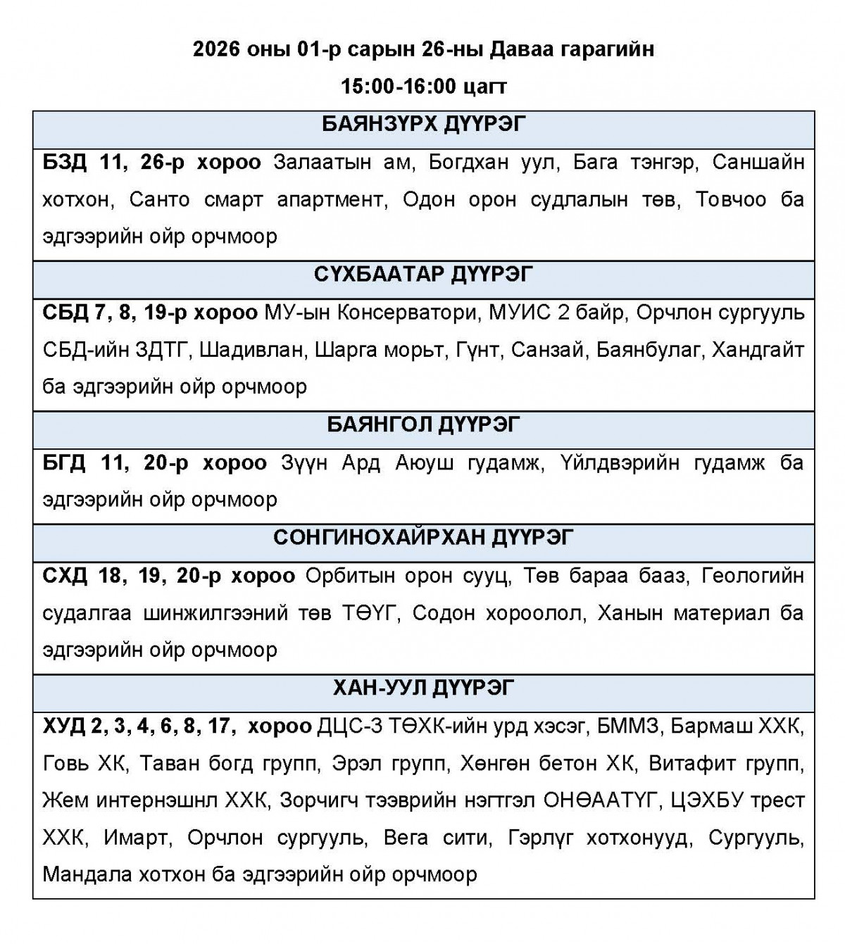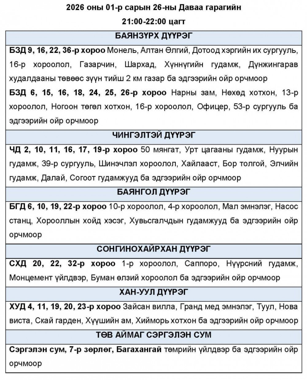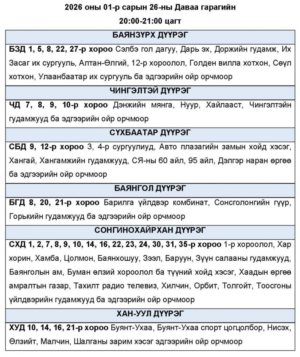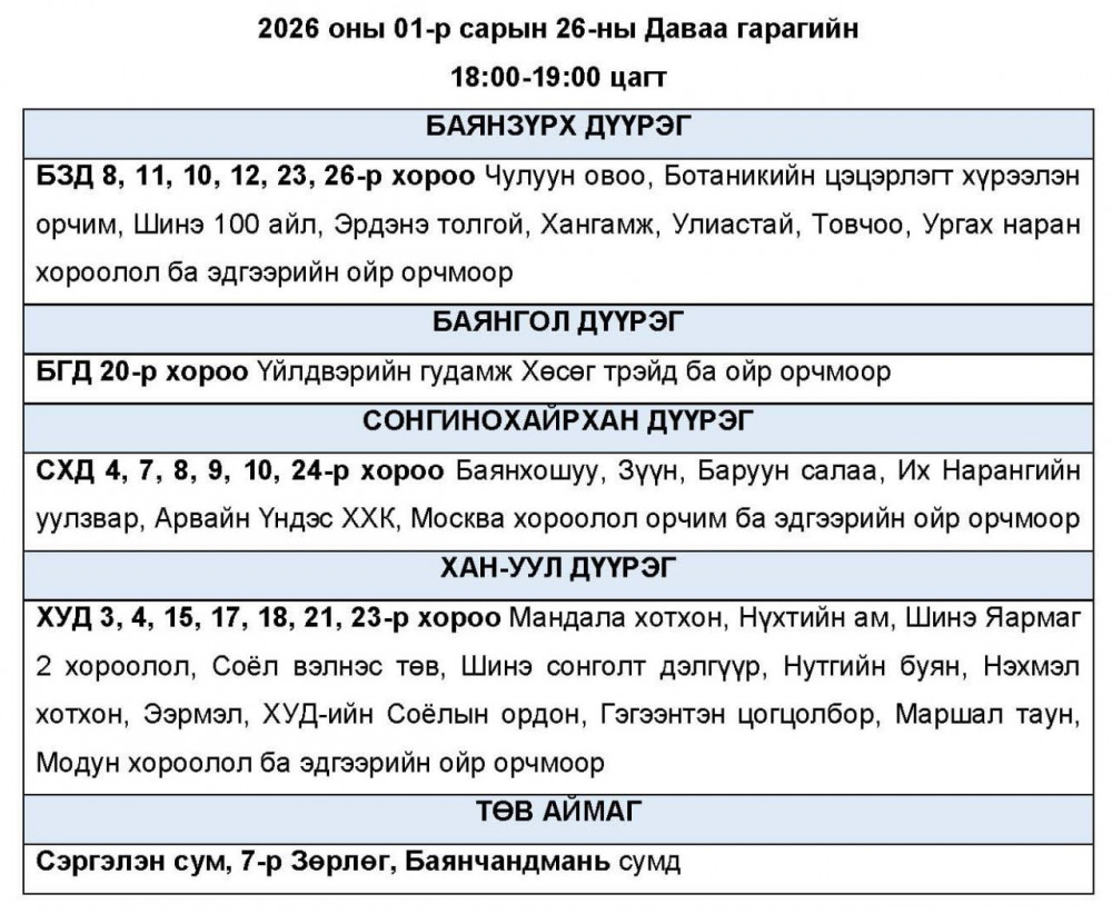 2026 оны 01-р сарын 26-ны Даваа гарагт цахилгаан эрчим хүчний “ХЯЗГААРЛАЛТ ХИЙЖ БОЛЗОШГҮЙ” байршлуудын хуваарийг УБЦТС ТӨХК-аас мэдээллээ.