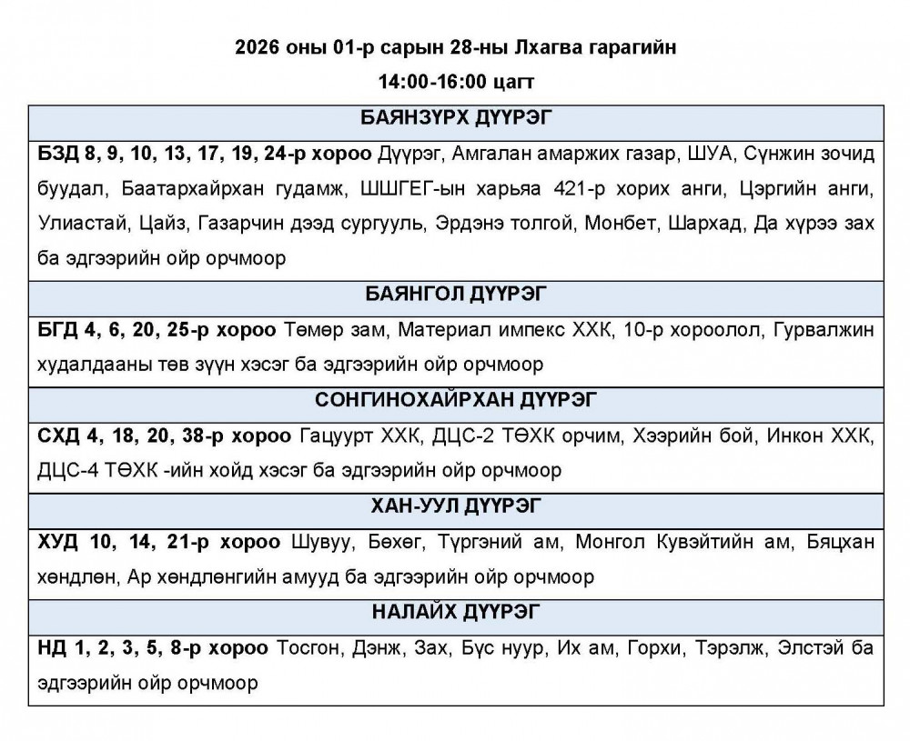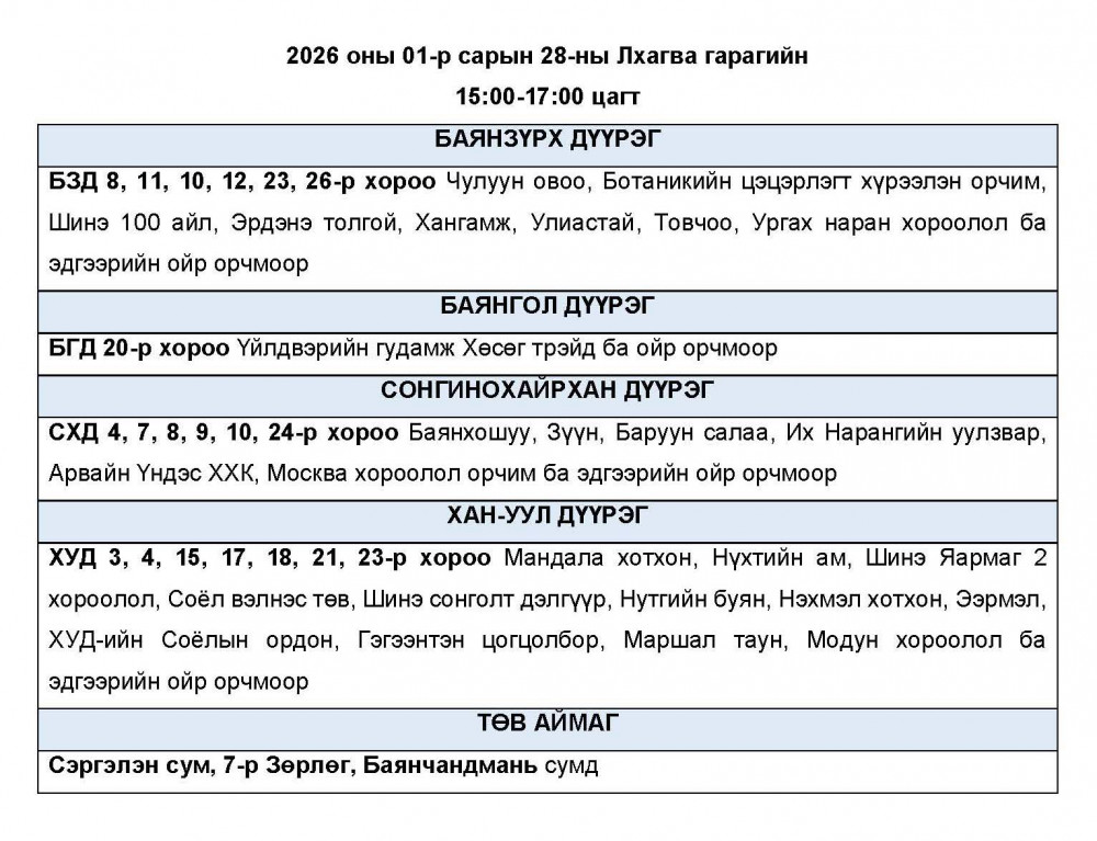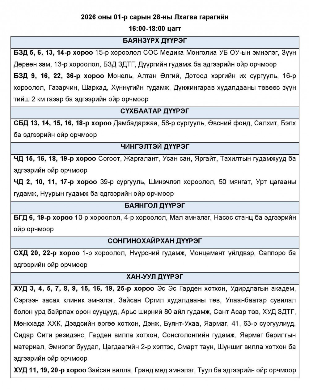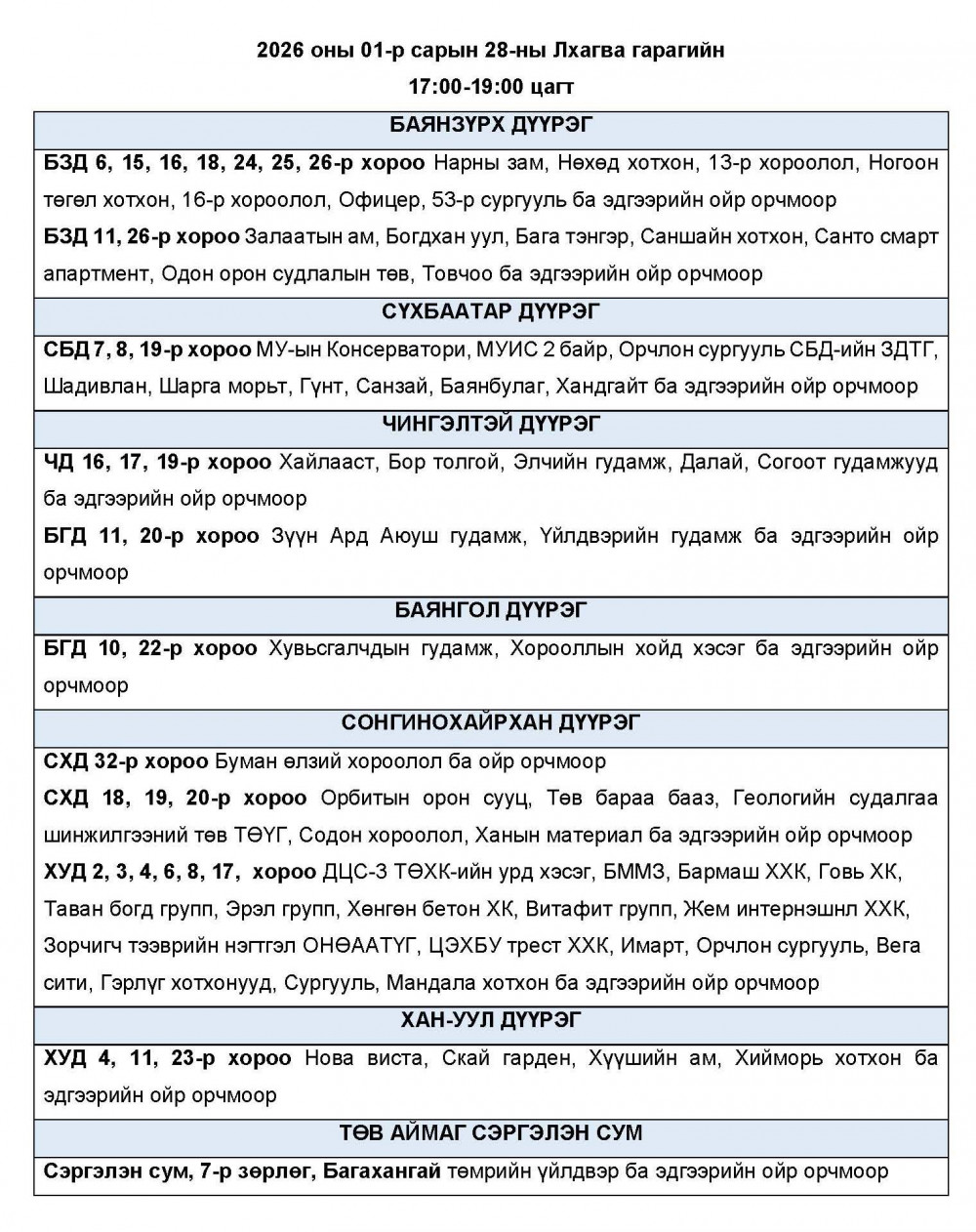 2026 оны 1-р сарын 28-ны Лхагва гарагт хийх ЦАХИЛГААНЫ ХЯЗГААРЛАЛТЫН ХУВААРЬ-ийг УБЦТС ТӨХК-аас мэдээллээ.