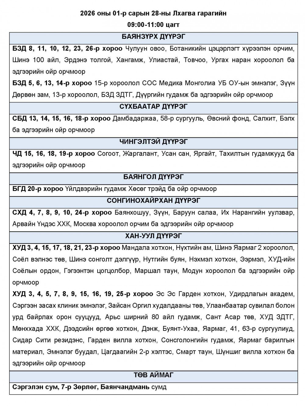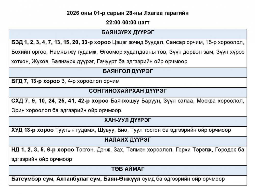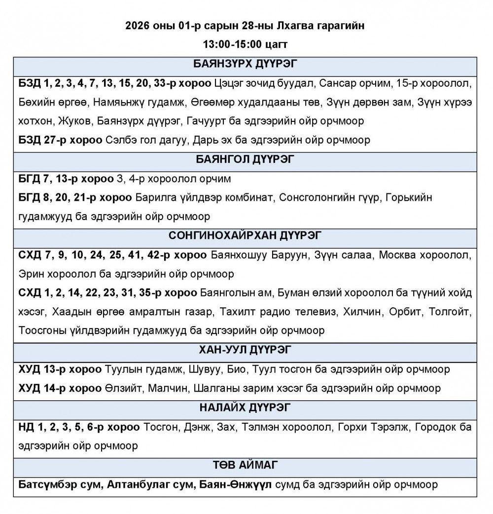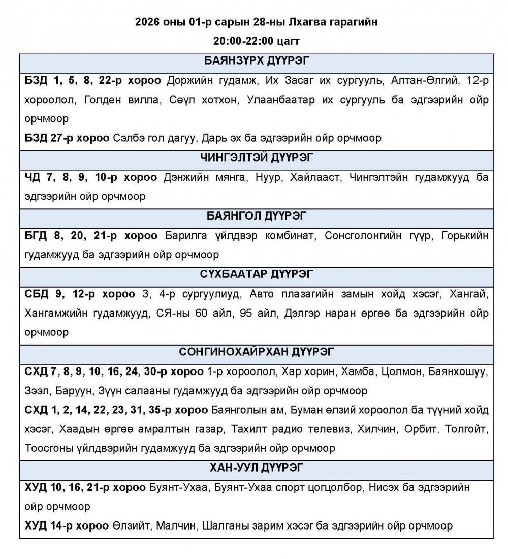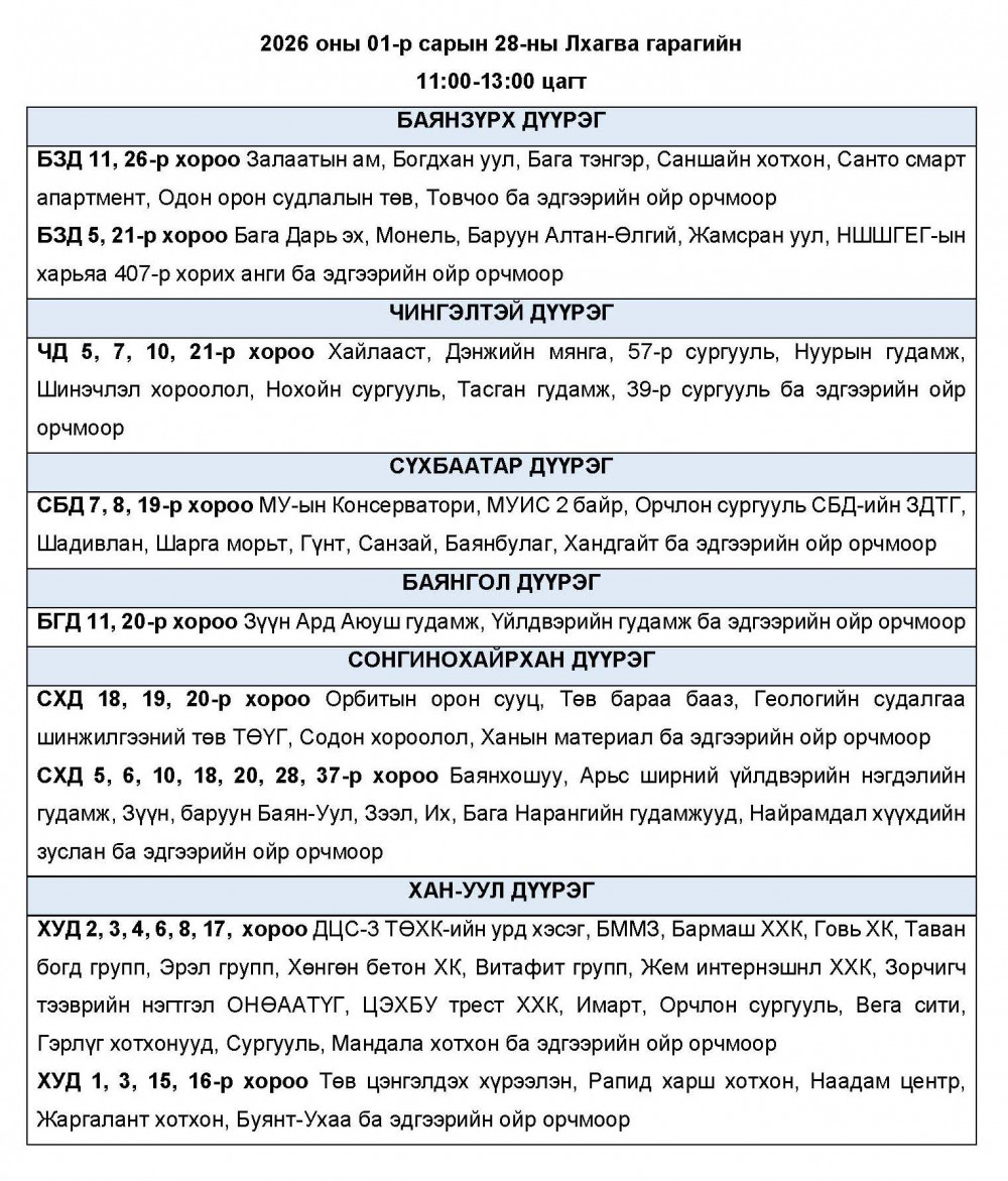 2026 оны 1-р сарын 28-ны Лхагва гарагт хийх ЦАХИЛГААНЫ ХЯЗГААРЛАЛТЫН ХУВААРЬ-ийг УБЦТС ТӨХК-аас мэдээллээ.