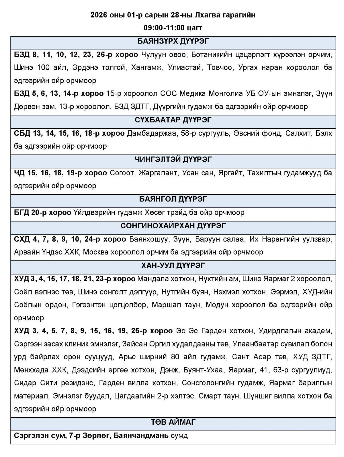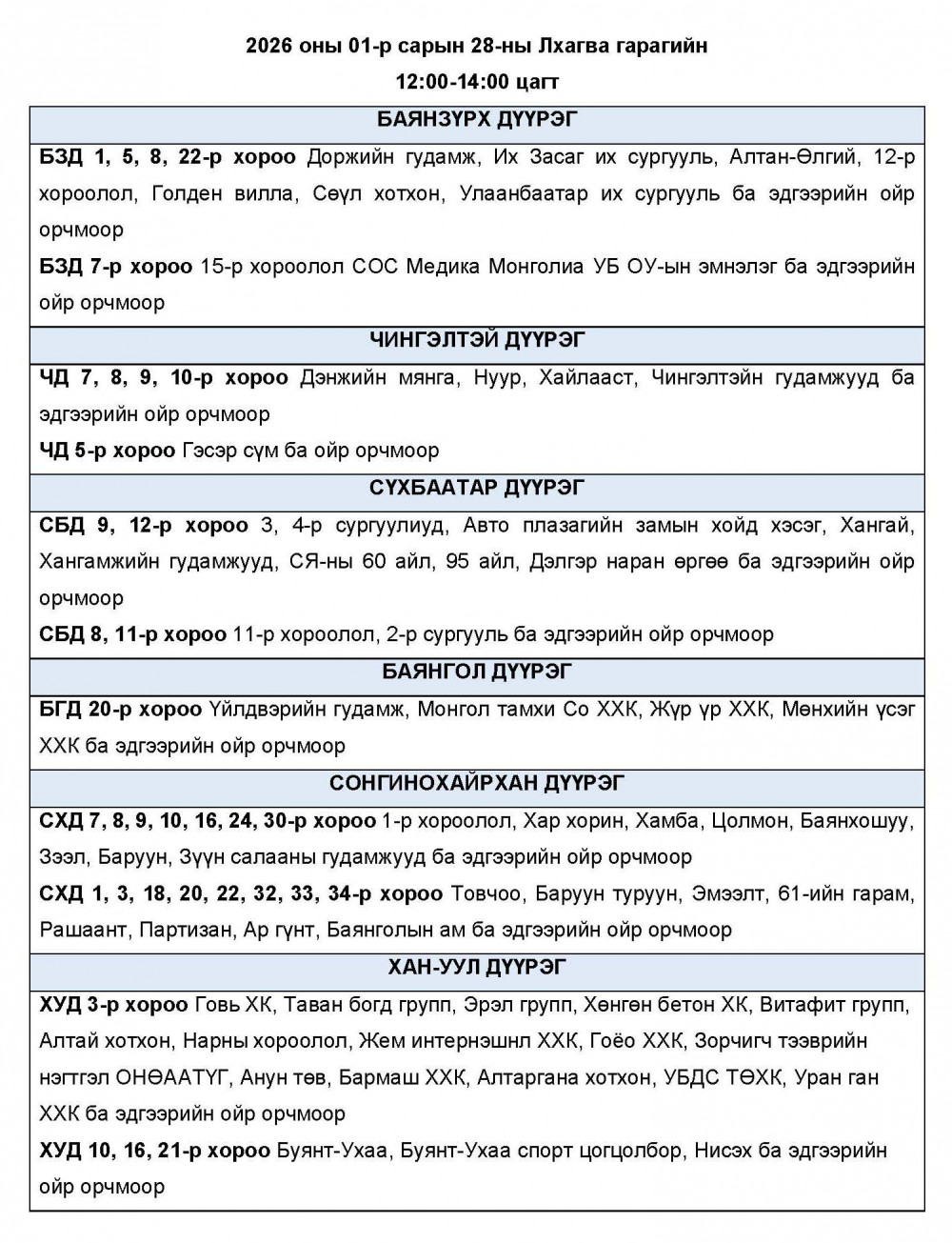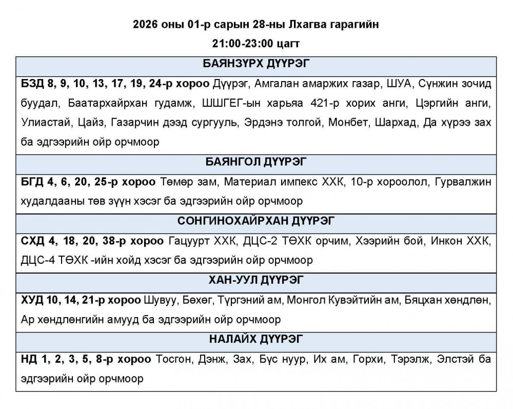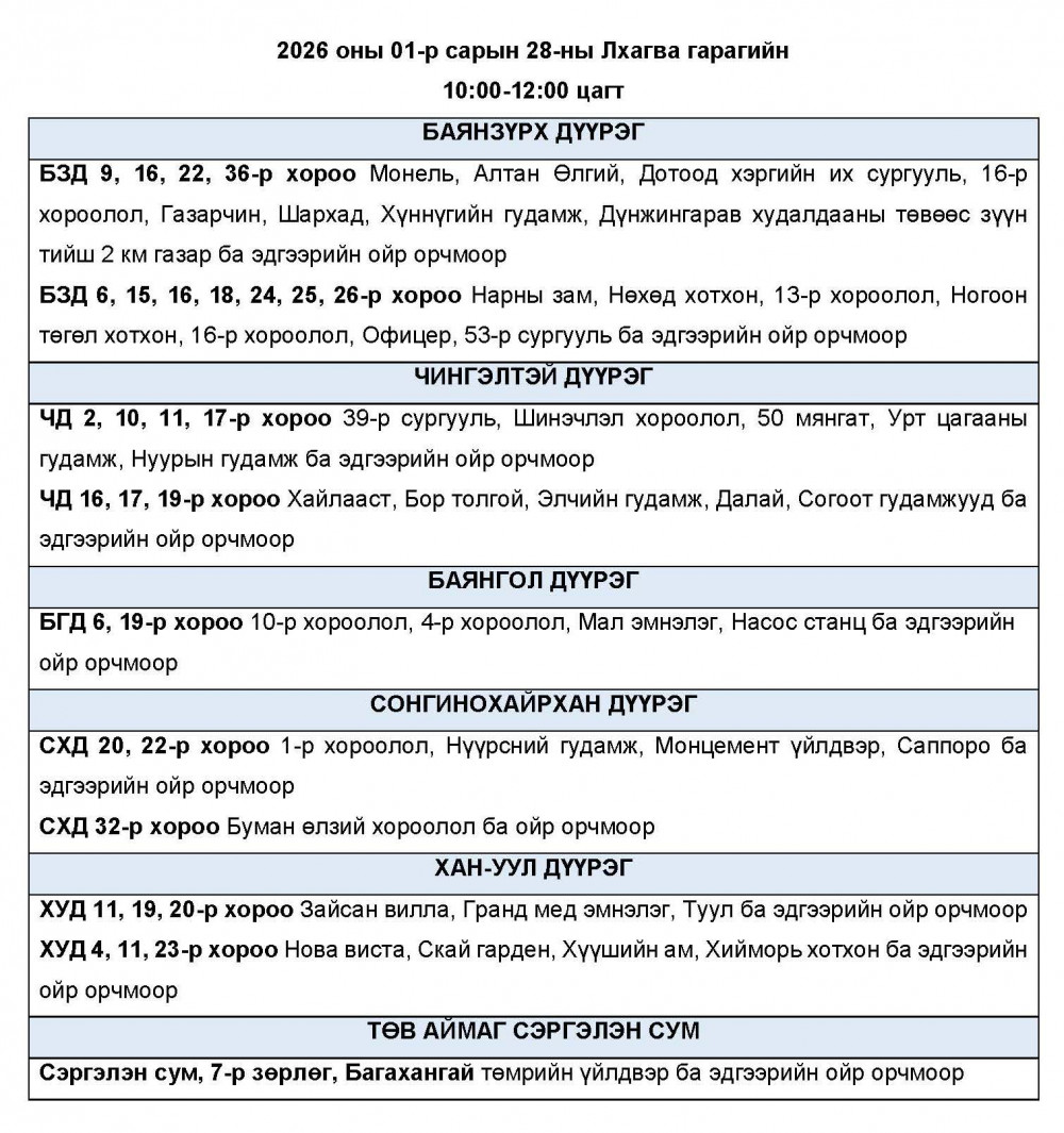 2026 оны 1-р сарын 28-ны Лхагва гарагт хийх ЦАХИЛГААНЫ ХЯЗГААРЛАЛТЫН ХУВААРЬ-ийг УБЦТС ТӨХК-аас мэдээллээ.