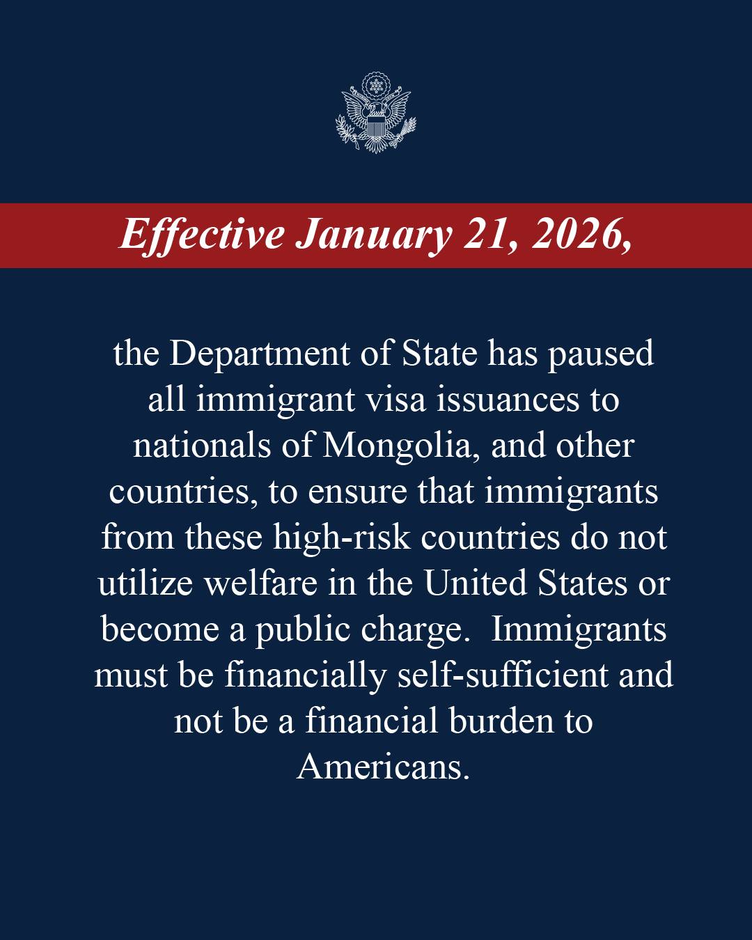 АНУ-ын Төрийн департамент 2026 оны 1-р сарын 21-ний өдрөөс эхлэн Монгол Улс болон зарим бусад улсын иргэдэд цагаачлалын виз олгохыг тодорхойгүй хугацаагаар зогсоосон.