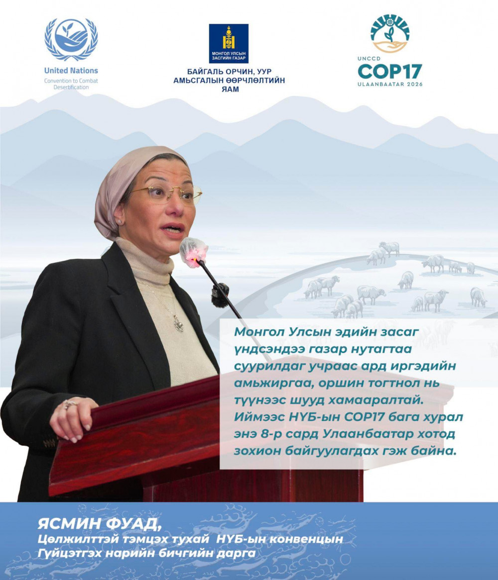 “Эх байгалиа сэргээж, итгэл найдвараа бадраая” — Цөлжилт, газрын доройтол, ган гачигтай тэмцэх НҮБ-ын Талуудын 17-р бага хурлын (COP17) албан ёсны уриаг өнөөдөр (2026.02.05) зарлалаа.