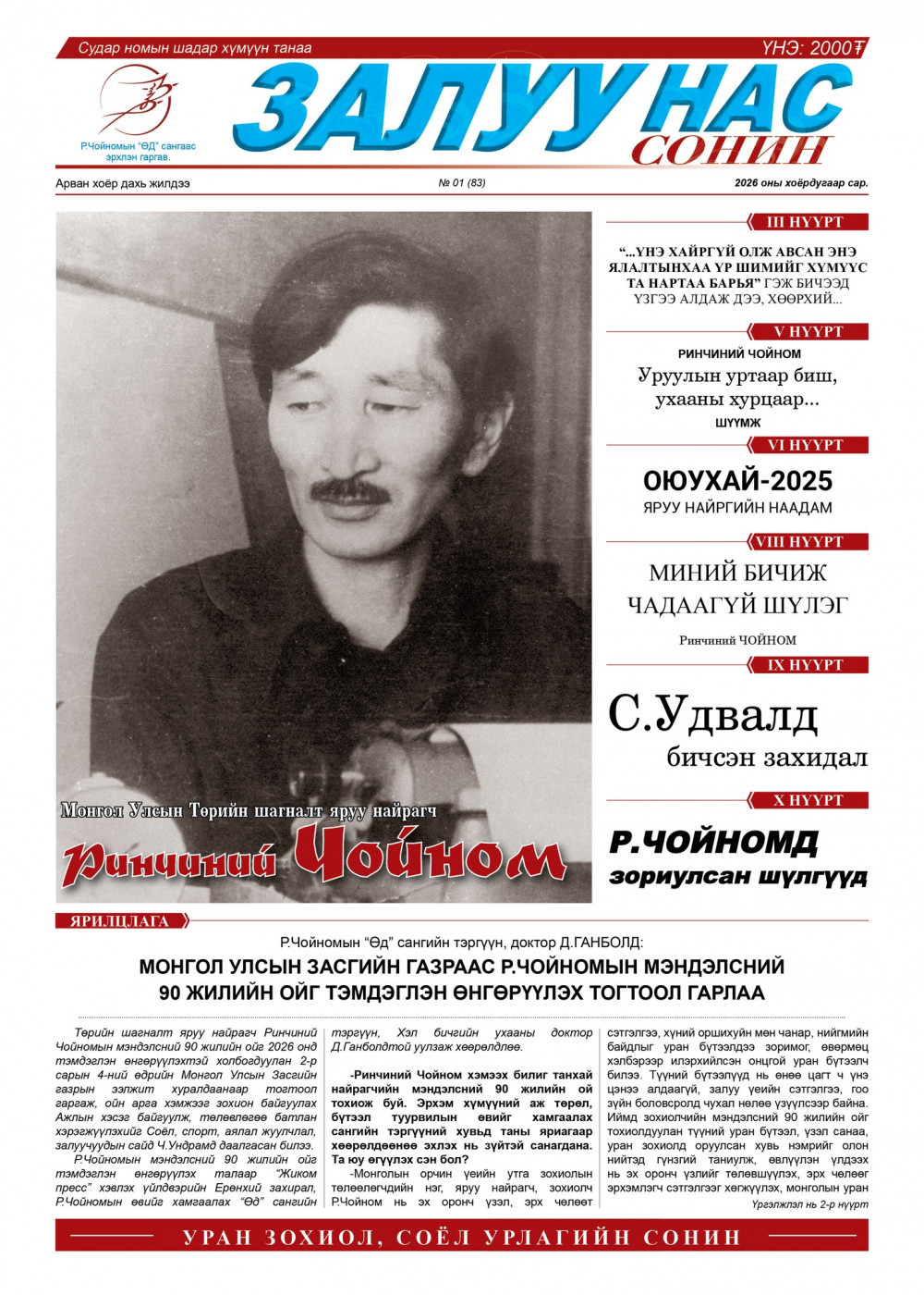 Р.Чойномын "Өд" сангаас мэндэлсний 90 жилийн ойн өдөрт нь зориулан "Залуу нас" сонинг эрхлэн гаргасан байна.