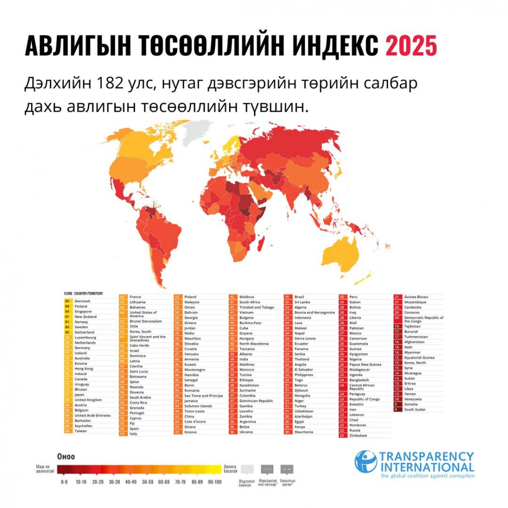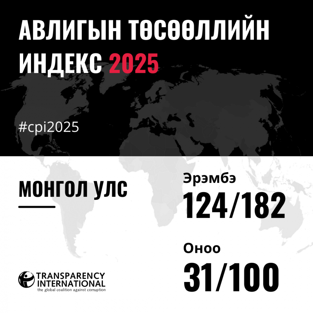 2025 оны Авлигын төсөөллийн индексийг өнөөдөр /2026.02.10/ зарлалаа. Монгол Улс Авлигын төсөөллийн индексээр 182 орноос 124-д бичигдэж, өмнөх оноос 10 байр ухарсан байна.