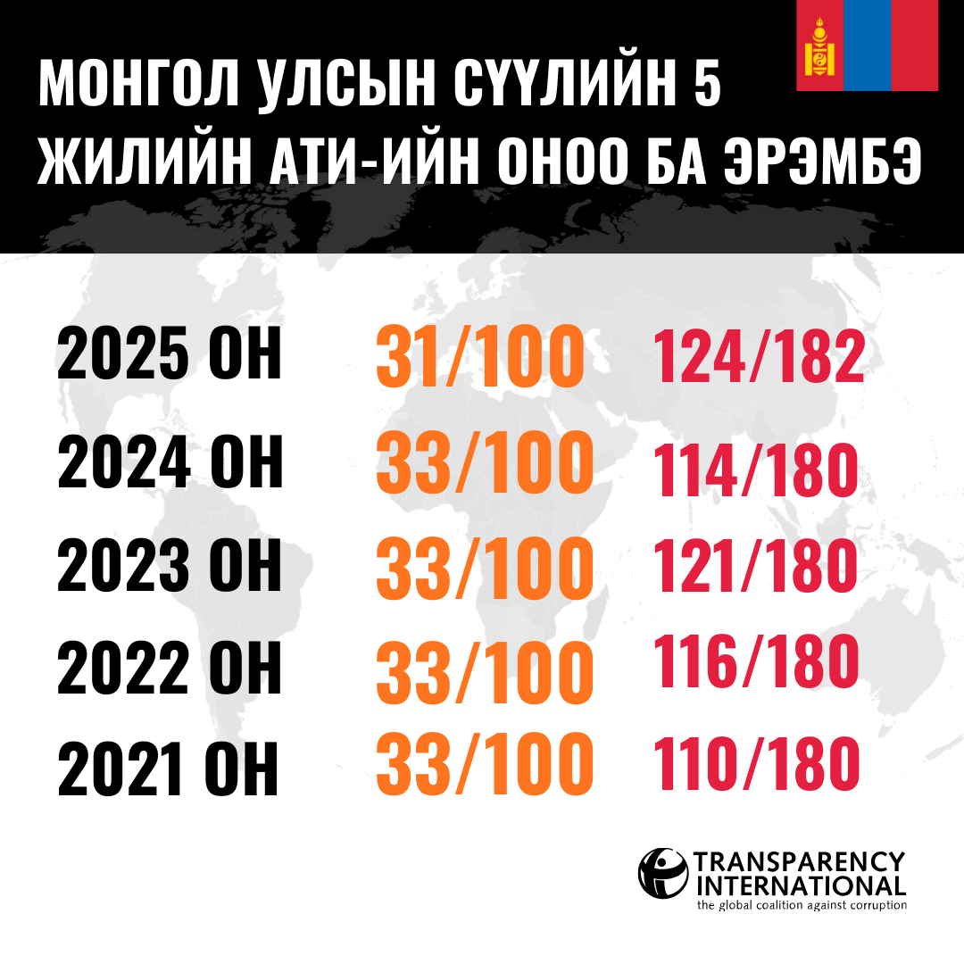 Манай улсын авлигын төсөөллийн индекс 2024 онд л урагшилсан бол 2022, 2023, 2025 онуудад буурсан үзүүлэлттэй байгаа юм.