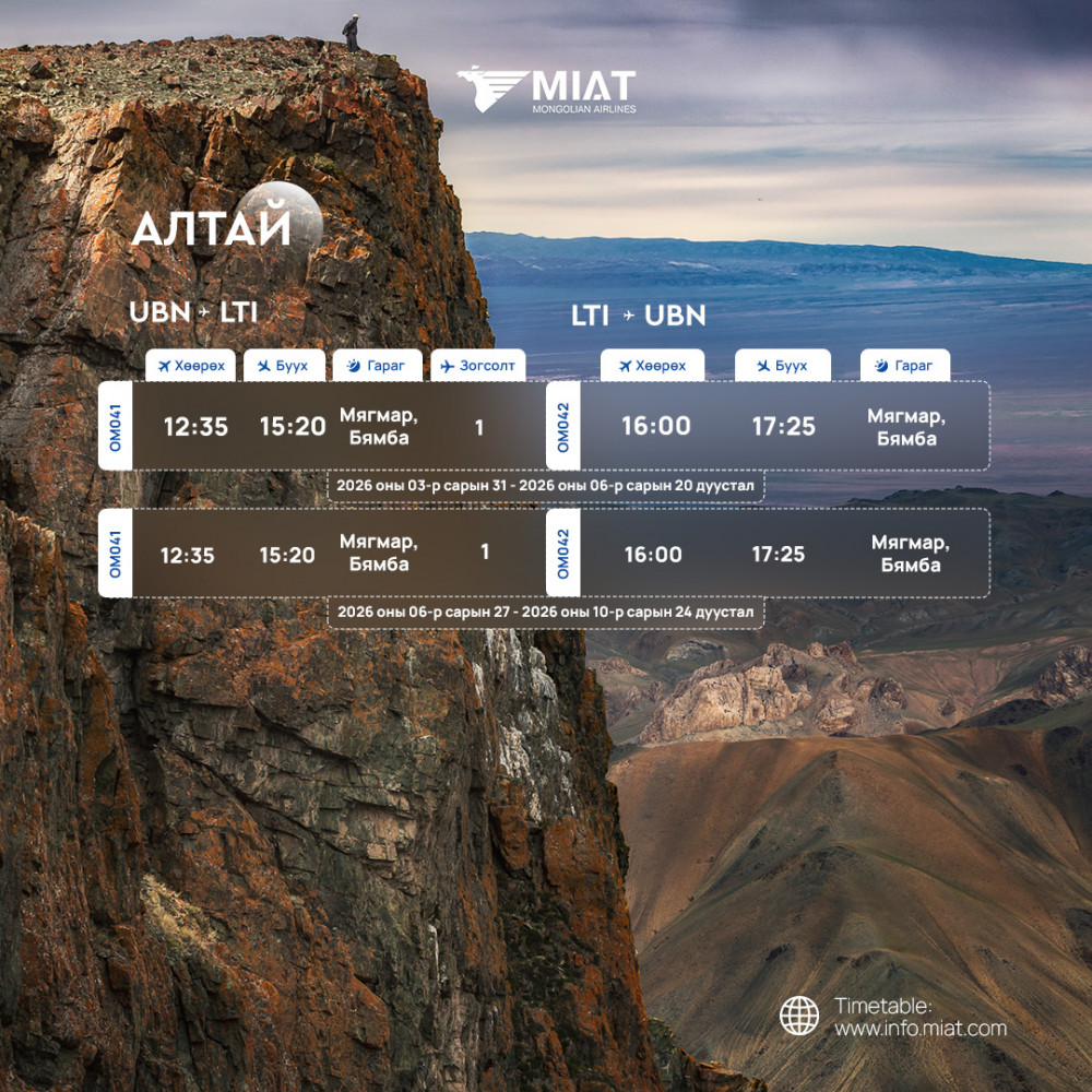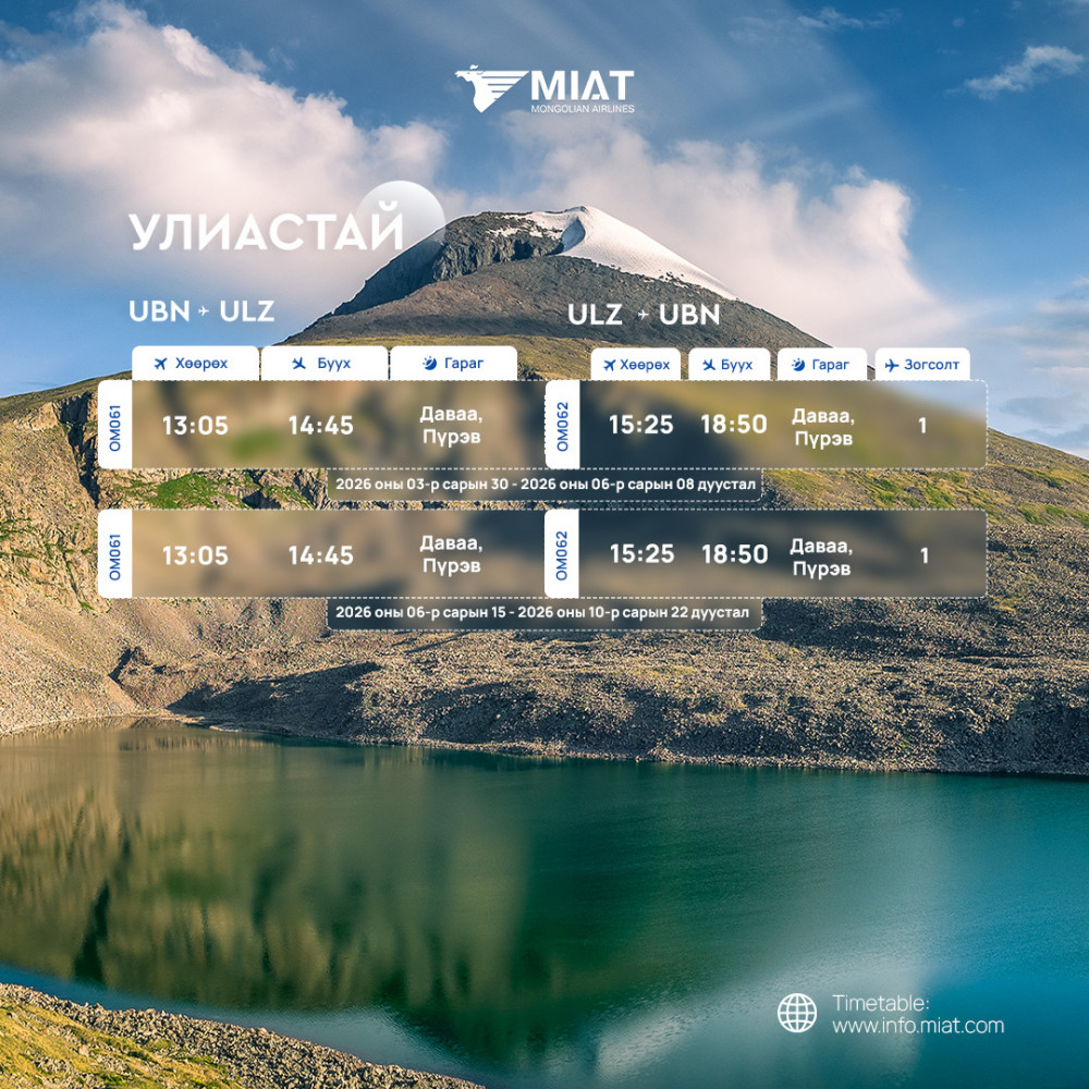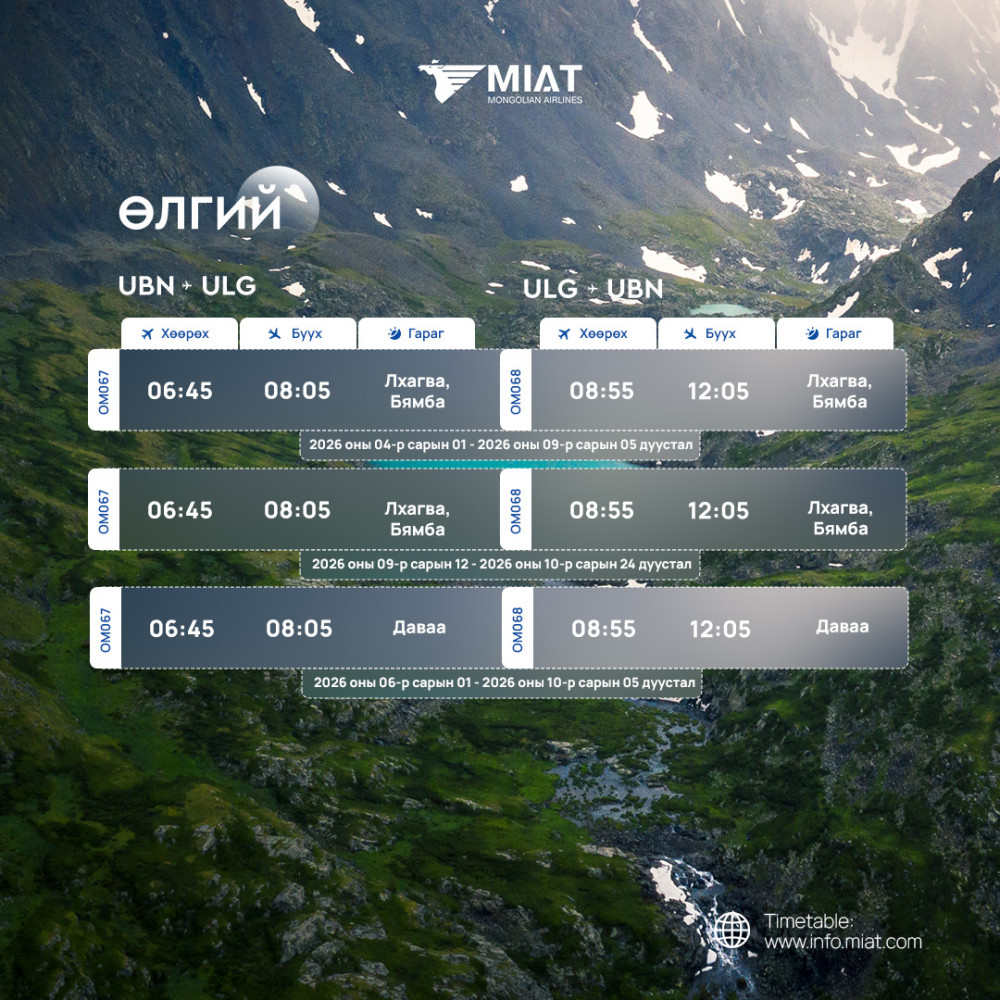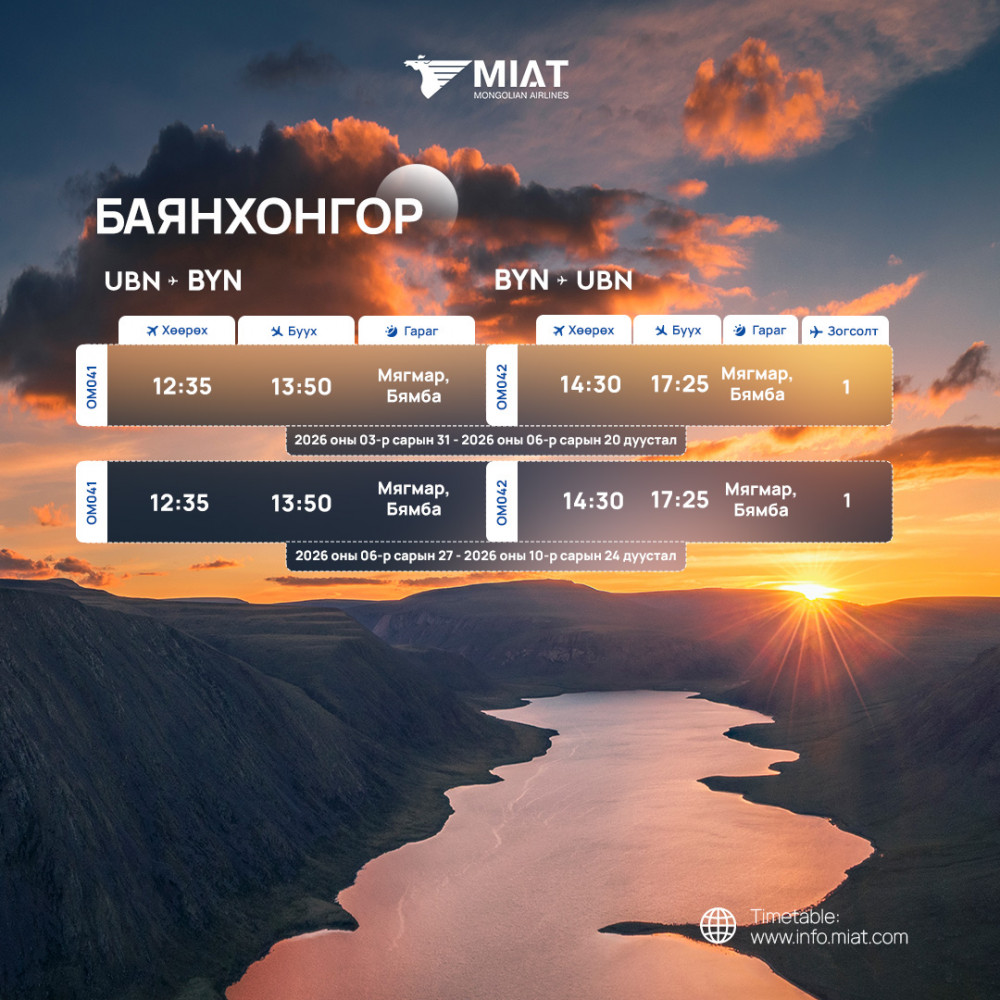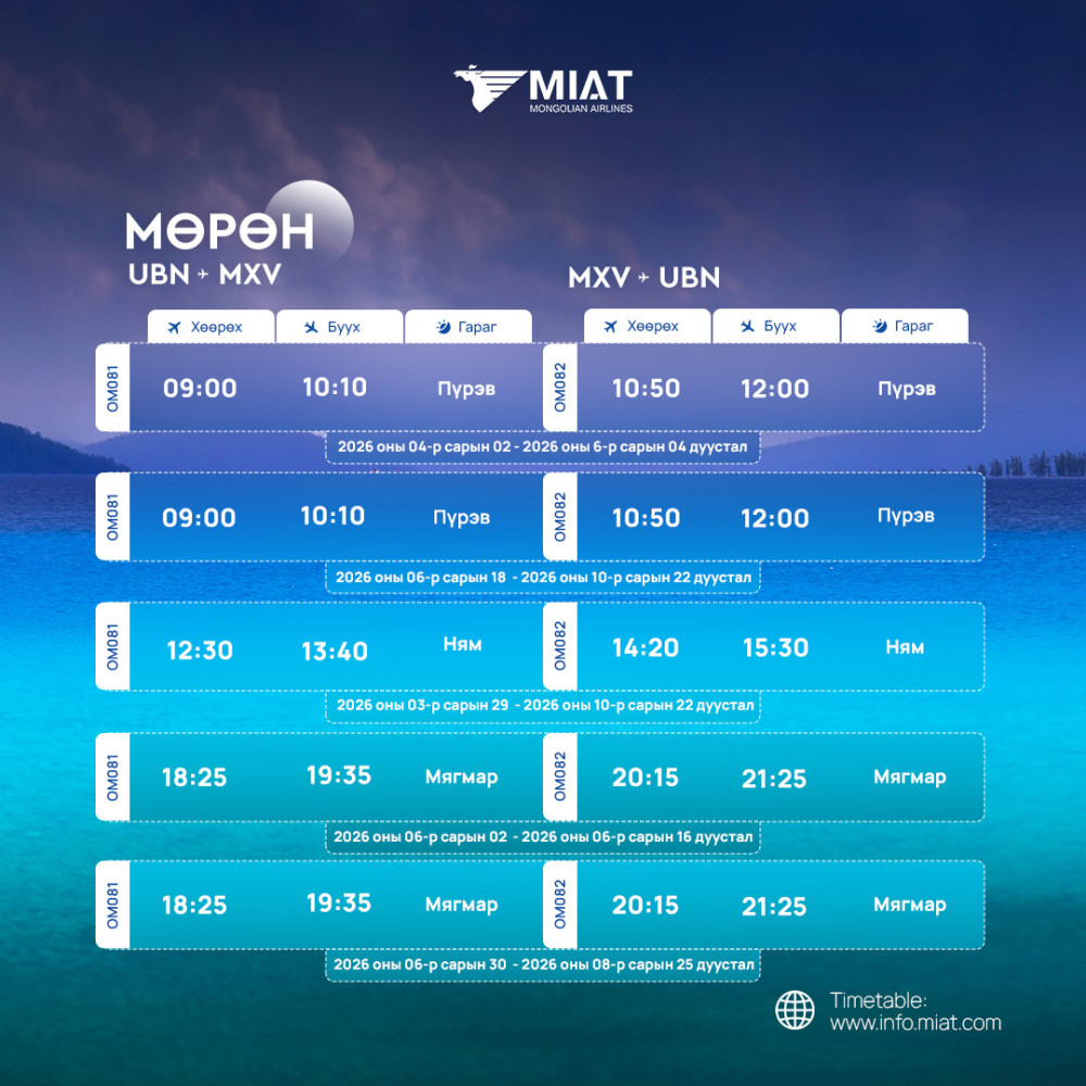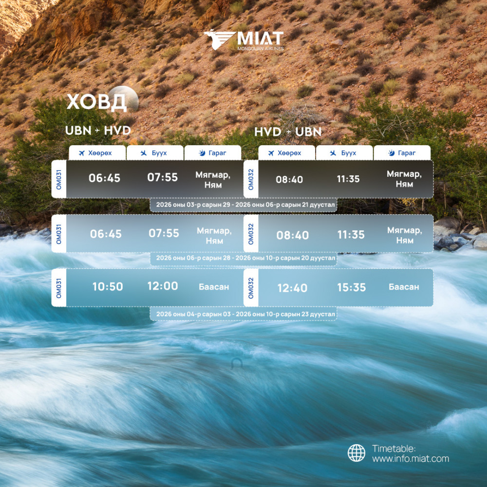 МИАТ ТӨХК 2026 оны гуравдугаар сарын 29-ний өдрөөс 2026 оны аравдугаар сарын 24-ний өдрийг дуусталх хугацаанд мөрдөх орон нутгийн нислэгийн зуны цагийн хуваарийг танилцуулж байна.