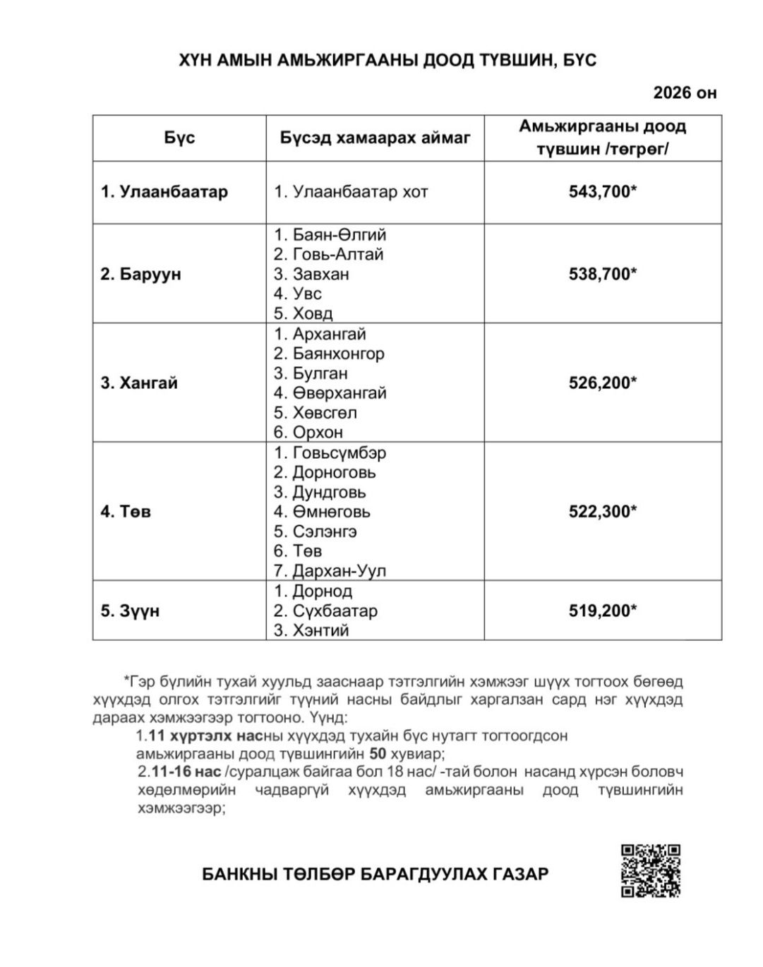 Амьжиргааны түвшний доод хэмжээ бүсээс хамаарч 519,200-543,700 төгрөгийн хооронд байна.