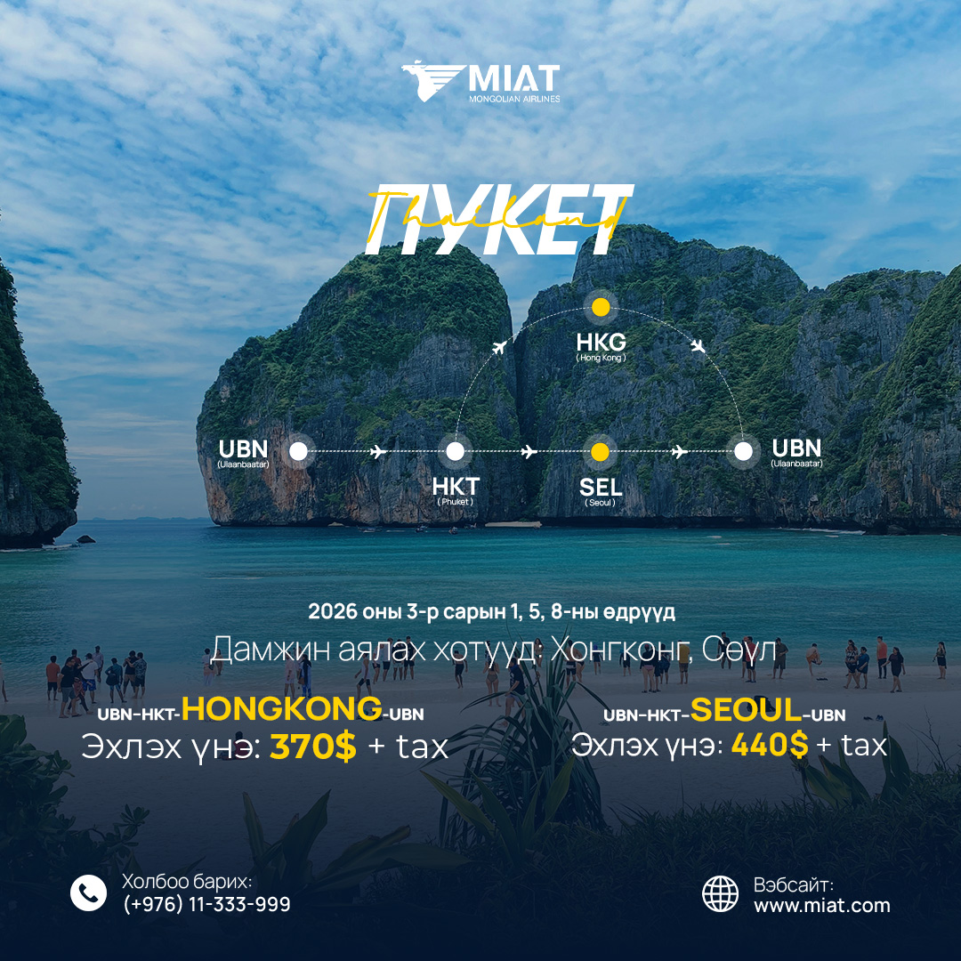 МИАТ ТӨХК-ийн үйлчлүүлэгч гуравдугаар сарын 1, 5, 8-ны өдрүүдэд Улаанбаатар–Пукет-Хонгконг-Улаанбаатар, Улаанбаатар–Пукет-Сөүл-Улаанбаатар чиглэлд хамгийн хямд үнээр зорчих боломжтой боллоо.