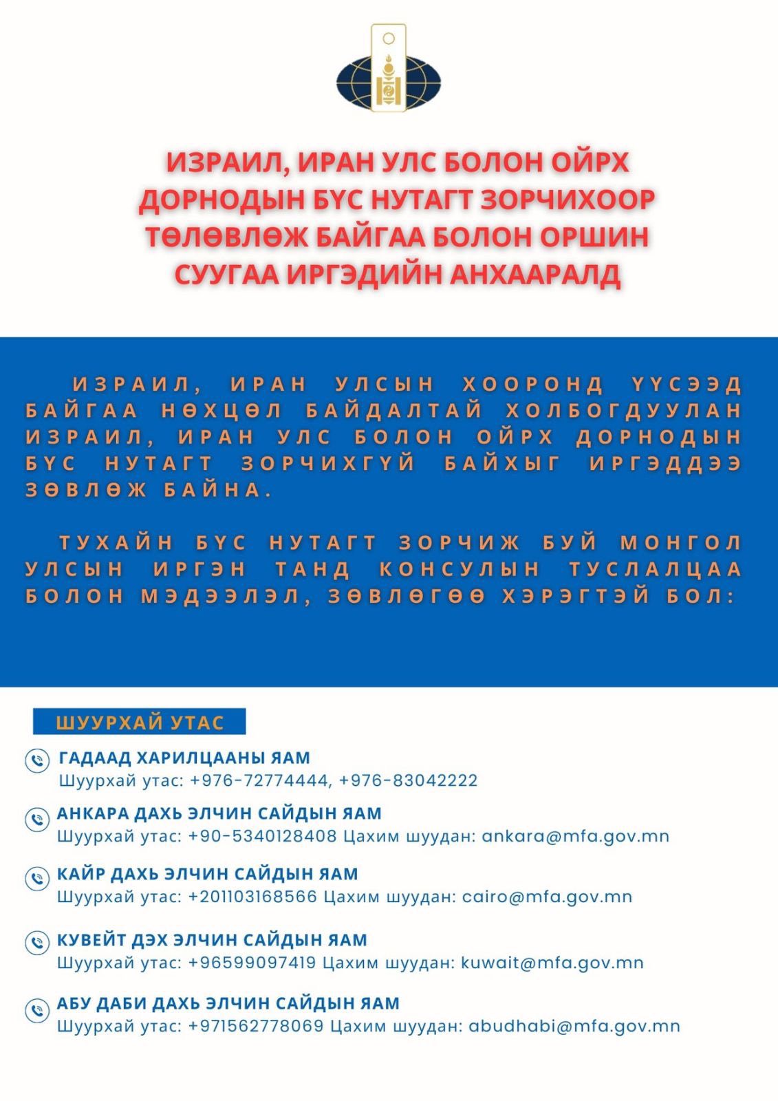 -Арабын Нэгдсэн Эмират Улсад суугаа ЭСЯ-тай +971562778069 дугаарын шуурхай утас, abudhabi@mfa.gov.mn цахим шуудангаар тус тус холбогдох боломжтой.