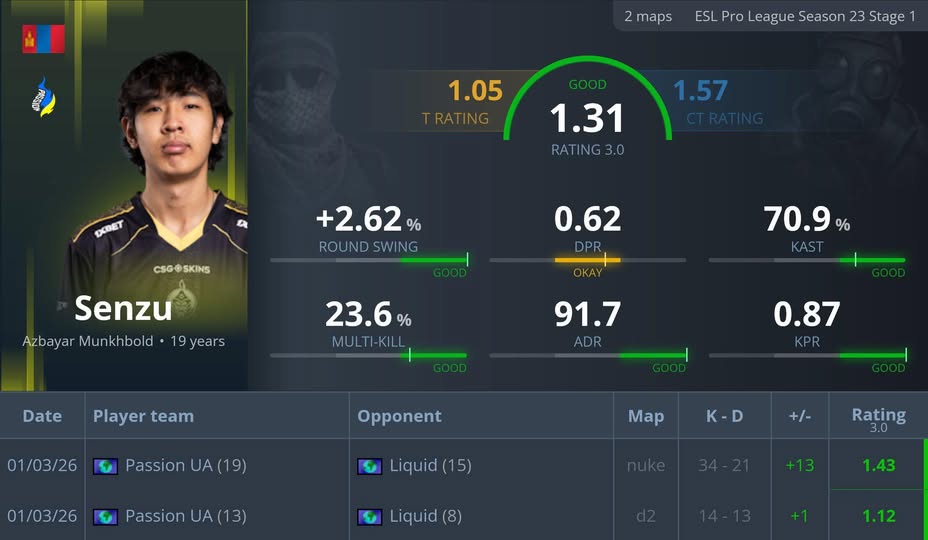 Senzu Passion UA багийн бүрэлдэхүүнд анхны тоглолтоо хийж, баг нь Team Liquid-ийг хоёр үе дараалан хожиж, шинэ бүрэлдэхүүнтэй хийсэн эхний цувралаа ялалтаар өндөрлүүллөө.