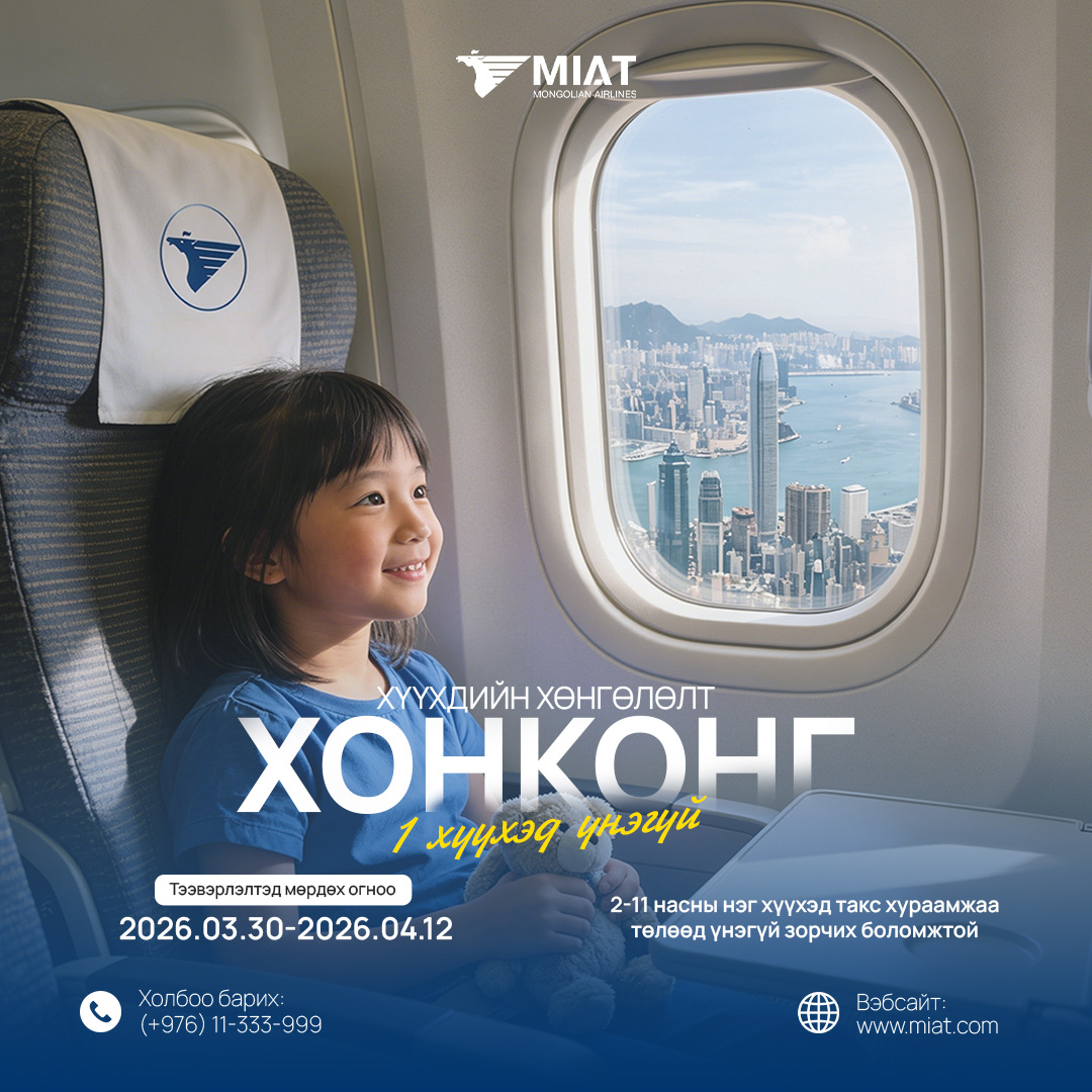 МИАТ ТӨХК нь сурагчдын хаврын амралтыг тохиолдуулан Хонконг чиглэлийн нислэгтээ 2026 оны гуравдугаар сарын 30-ны өдрөөс 2026 оны дөрөвдүгээр сарын 12-ны өдрийг дуусталх хугацаанд ХҮҮХДИЙН ХӨНГӨЛӨЛТ зарлалаа.