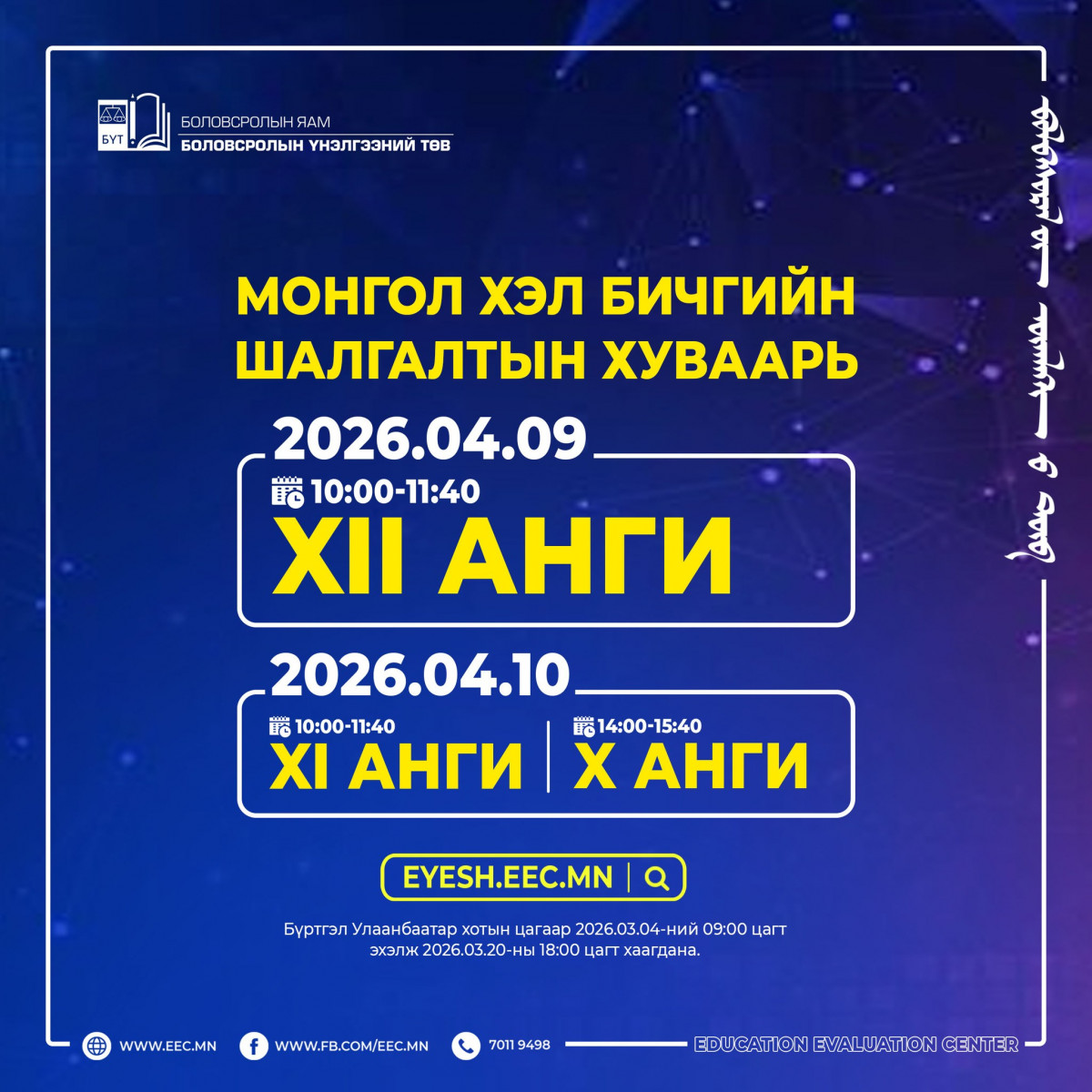 Дээрх чиглэлийн дагуу 2026 оны 03 дугаар сарын 07-ны өдөр “Турших шалгалт”-ыг зохион байгуулсан боловч мэдээллийн технологийн дэд бүтэц, программ хангамжийн хүчин чадал, серверийн ачаалал зэрэг техникийн нөхцөл байдлаас шалтгаалан шалгалтыг цахим хэлбэрээр тогтвортой зохион байгуулах боломжгүй байна. Иймд Монгол хэл бичгийн шалгалтыг цахимаар зохион байгуулахыг түр хугацаанд хэрэгжүүлэхгүй байхаар шийдвэрлэж, 2026 оны 4 дүгээр сарын 09-ний өдөр болон 2026 оны 4 дүгээр сарын 10-ны өдрүүдэд танхимаар зохион байгуулна.