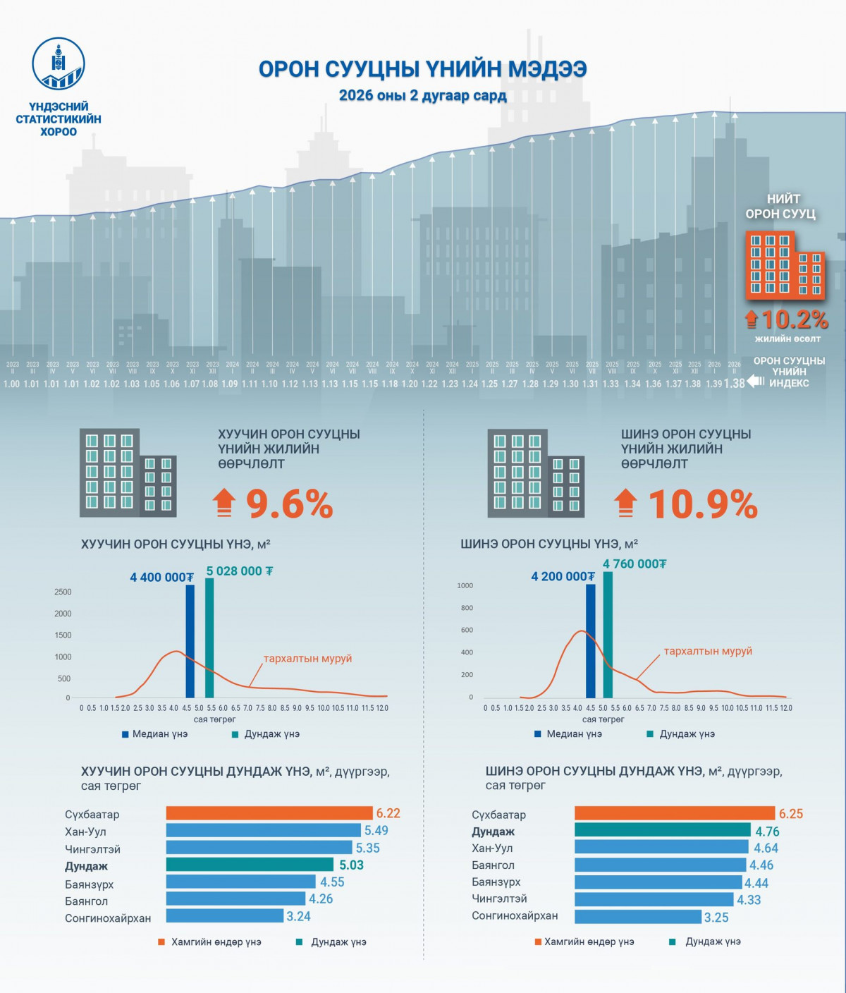2026 оны 2 дугаар сард шинэ орон сууцны 1 метр квадрат талбайн дундаж үнэ 4.76 сая төгрөг болж, Сүхбаатар дүүрэгт хамгийн өндөр буюу 6.25 сая төгрөгийн үнэтэй байгаа юм. Шинэ орон сууцны дундаж үнэ өмнөх оны мөн үетэй харьцуулахад Сүхбаатар дүүрэгт 11.4 хувь (637.1 мянган төгрөг)-аар өсөж, Чингэлтэй дүүрэгт 1.4 хувь (60.5 мянган төгрөг)-аар буурсан байна.