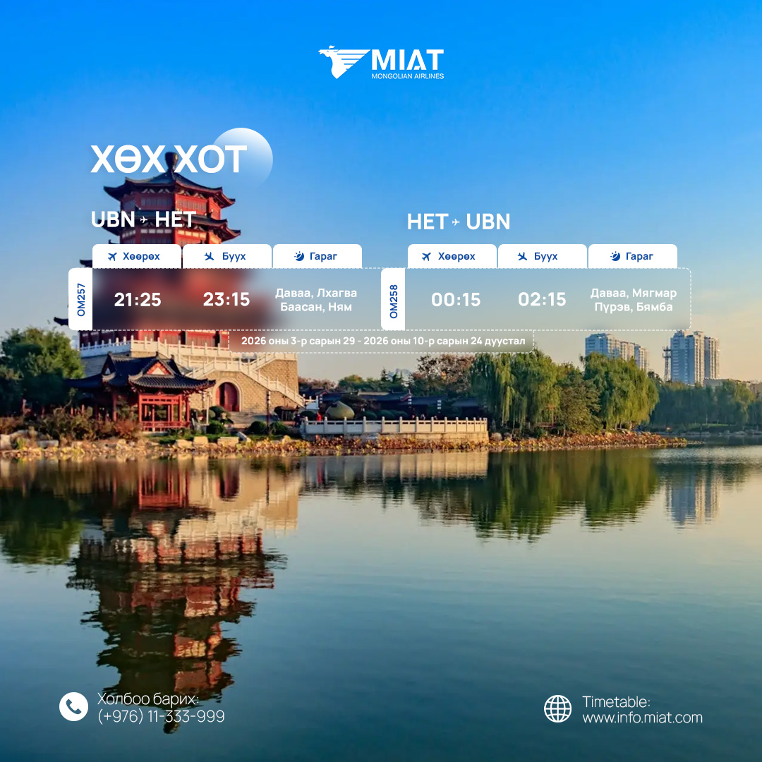 МИАТ ТӨХК Хөх хот чиглэлийн 2026 оны зуны цагийн хуваариа танилцууллаа.