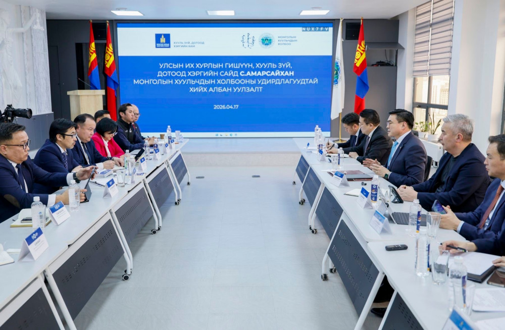 Хууль зүй, дотоод хэргийн сайд С.Амарсайхан өнөөдөр (2026.04.17) Монголын хуульчдын холбооны Ерөнхийлөгч М.Мөнхбат болон Монголын хуульчдын холбооны гишүүдтэй уулзаж, салбарын эрх зүйн шинэчлэл, хуульчдын мэргэжлийн үйл ажиллагаа, тулгамдсан асуудлын талаар санал солилцлоо.