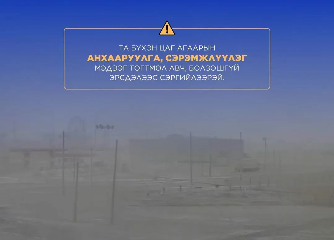 Иргэд та бүхэн цаг агаарын анхааруулга, сэрэмжлүүлэг мэдээг тогтмол авч, хол замд гарахгүй байх гээд болзошгүй эрсдэлээс сэргийлээрэй.