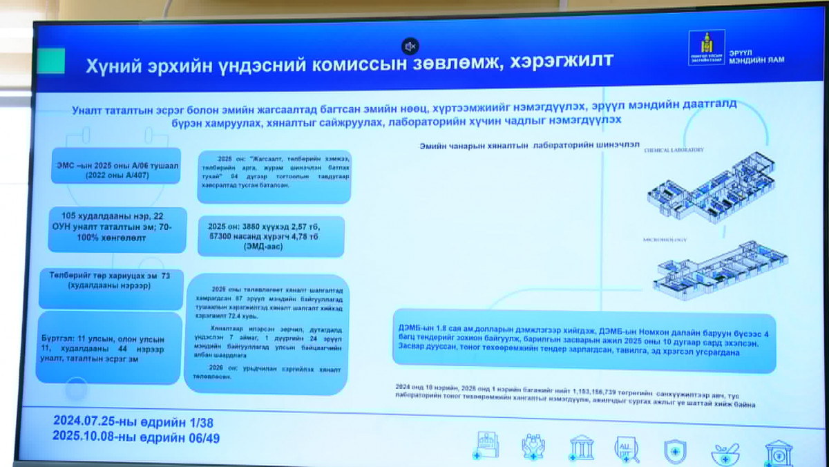 Хэлэлцүүлгээр Эрүүл мэндийн яам болон Эм, эмнэлгийн хэрэгслийн хяналт, зохицуулалтын газрын төлөөлөл зөвлөмжийн хэрэгжилт, эмийн нийлүүлэлт, хүртээмжийн өнөөгийн нөхцөл байдлын талаар мэдээлэл танилцуулж, оролцогчдын асуултад хариулт өгч, санал солилцов.