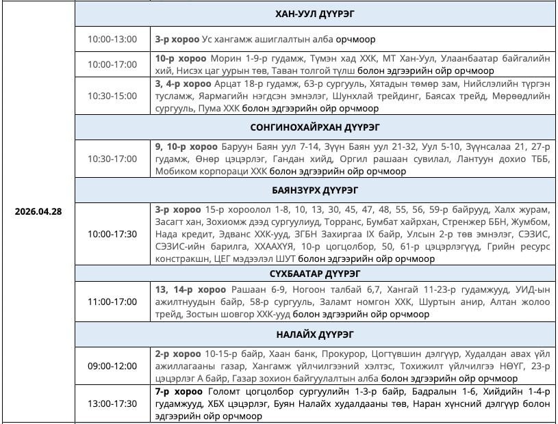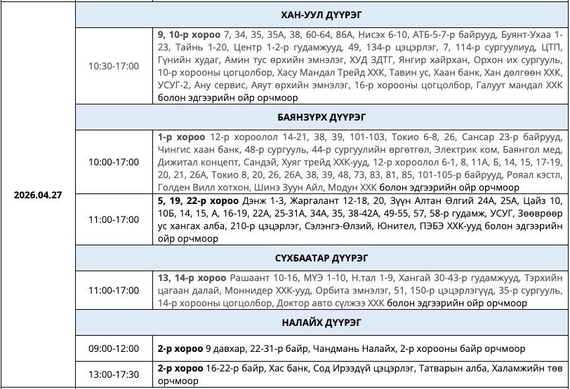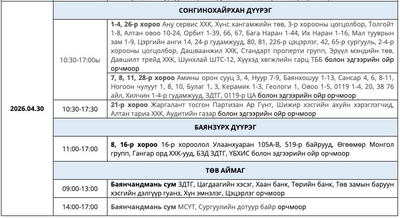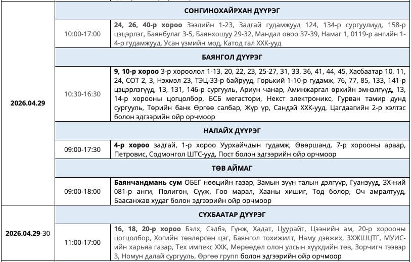 Цаг агаарын байдлаас шалтгаалан хуваарьт өөрчлөлт орвол иргэдийн гэрээнд бүртгэгдсэн дугаарт мэдээлэл хүргэх гэнэ.
